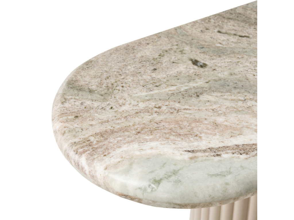 Toaletní stolek Coronel vnese do vaší ložnice eleganci s dotekem nadčasovosti. Jeho oválná deska z torontského mramoru s jemnou béžovohnědou kresbou vytvoří luxusní a zároveň harmonický prvek. Vysoká válcová podnož s žebrovanou texturou dodá stolku vzdušnost a lehkost. Perfektně poslouží jako místo pro váš oblíbený parfém, šperky nebo kosmetické doplňky. V kombinaci se zlatými nebo sametovými akcenty vytvoří dokonalé zázemí pro každodenní rituály krásy.