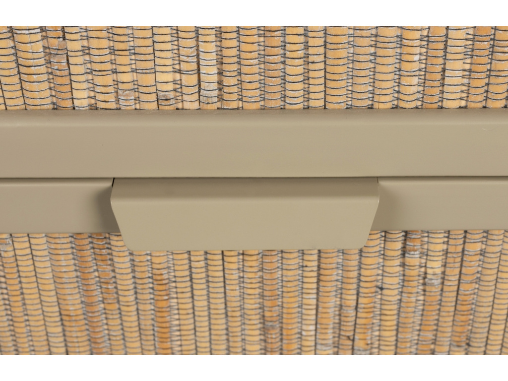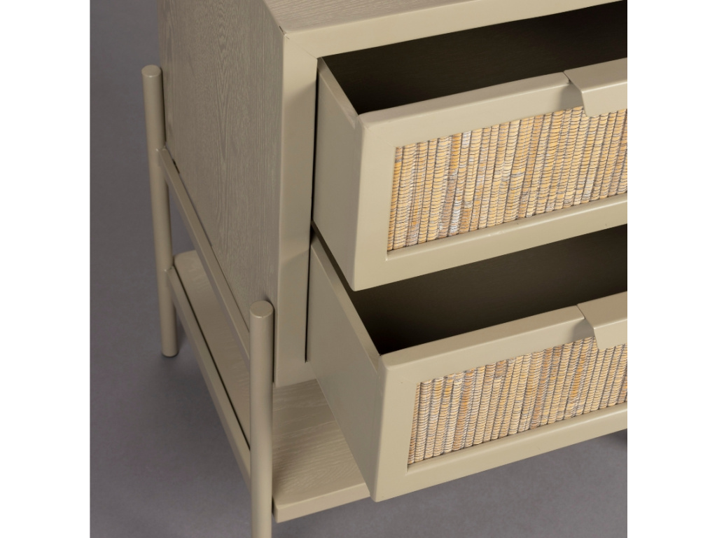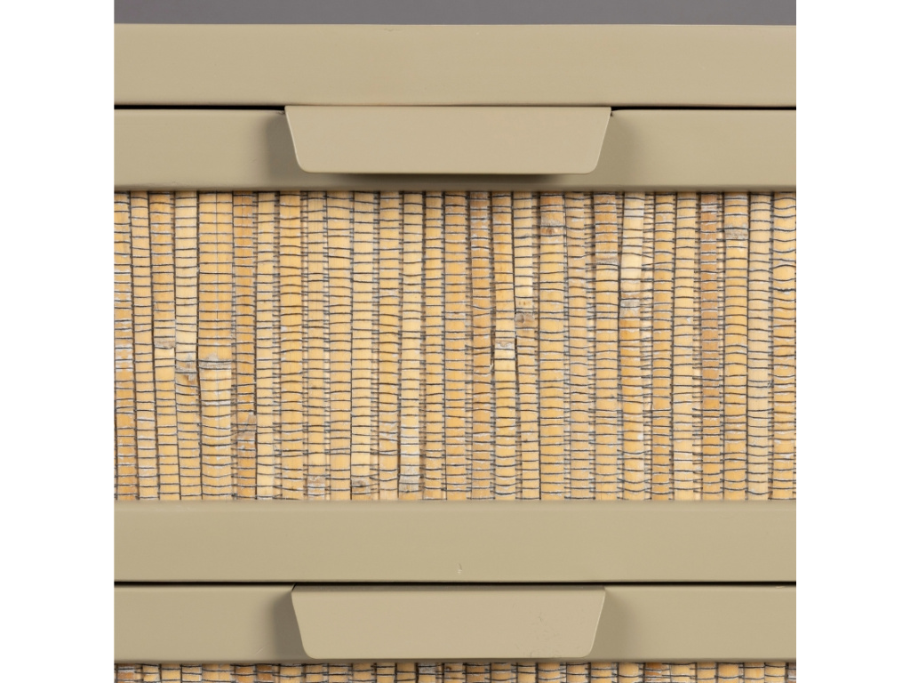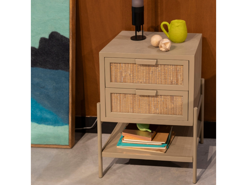 Odkládací stolek YASU od holandské značky DUTCHBONE zaujme svým originálním designem. Je vyroben z lakované dýhy z čínské jedle s dekorem z ratanového výpletu, což dodává stolku nádech exotiky. Stabilitu zajistí minimalistická kovová podnož stejné barvy jako korpus. YASU nabízí dostatek úložného prostoru v podobě dvou zásuvek a jedné police. Polici lze využít například na různé dekorace a doplňky a doladit tak celkový vzhled stolku a interiéru. Stolek YASU lze využít také jako noční stolek či malou komodu.
