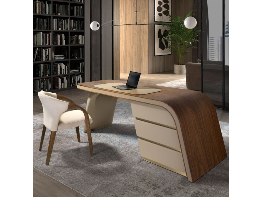 Tento luxusní pracovní stůl spojuje krásu přírodního ořechového dřeva s elegantním krémovým koženkovým čalouněním. Velkorysá pracovní plocha s jemnou kresbou ořechové dýhy poskytne dostatek místa pro práci, zatímco tři zásuvky s praktickým systémem "push and pull" usnadní uložení dokumentů či psacích potřeb. Béžové čalounění nejen podtrhne celkový design, ale také dodá stolu jemný a moderní vzhled. Díky precizně preciznímu zpracování a čistým liniím bude tento stůl harmonicky ladit s interiéry v přírodním či skandinávském stylu. Vytvoříte si tak funkční a zároveň stylové pracovní místo, kde se budete cítit příjemně.