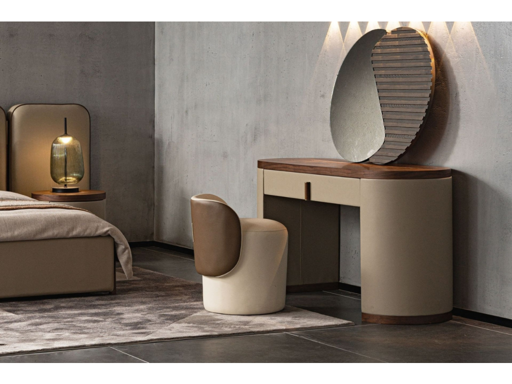 Toaletní stolek Angel Cerdá kombinuje ořechovou dýhu a čalounění z umělé kůže v norkovém odstínu. Skvěle se hodí do ložnice, šatny i pracovního koutku, jeho součástí je prostorná zásuvka uvnitř které najdete dřevěné přepážky, které pomohou udržet pořádek v kosmetice, špercích i kancelářských drobnostech. Horní deska z ořechové dýhy o tloušťce 0,5 mm nabízí dostatek prostoru na zrcadlo, lampu i drobnosti, které potřebujete mít po ruce.