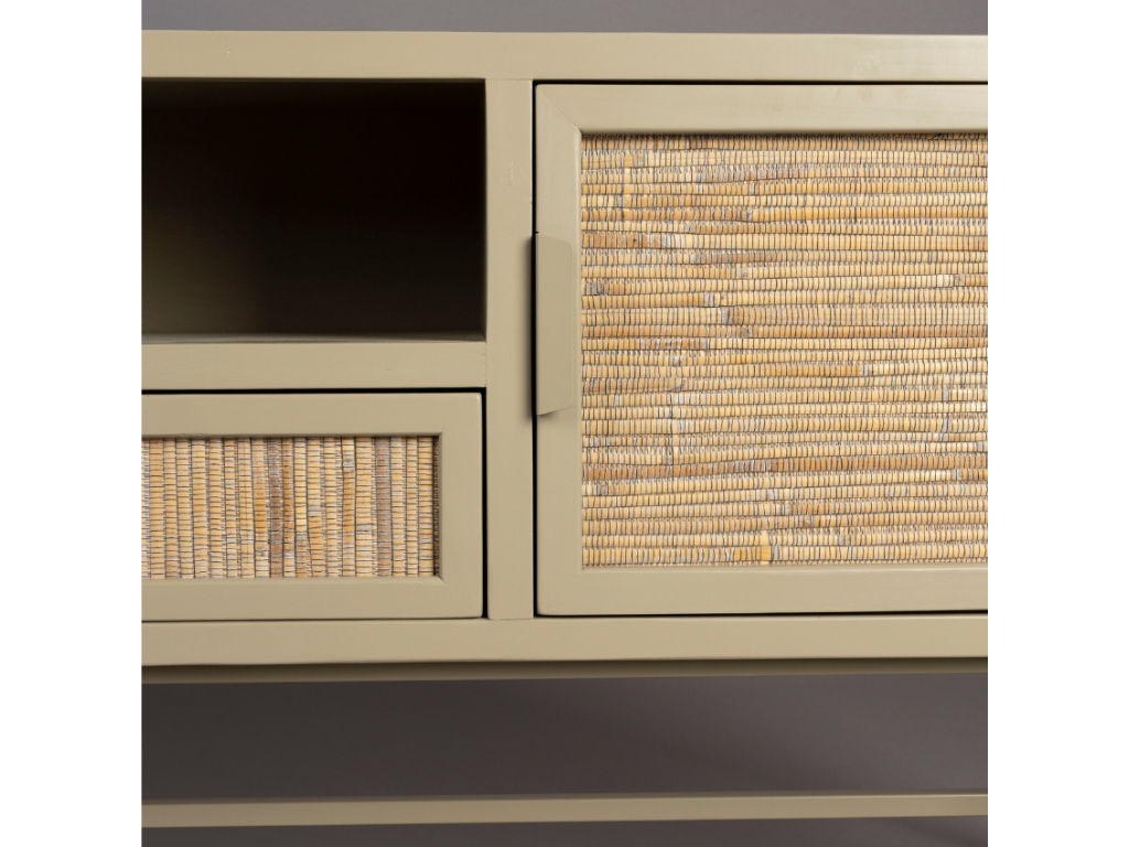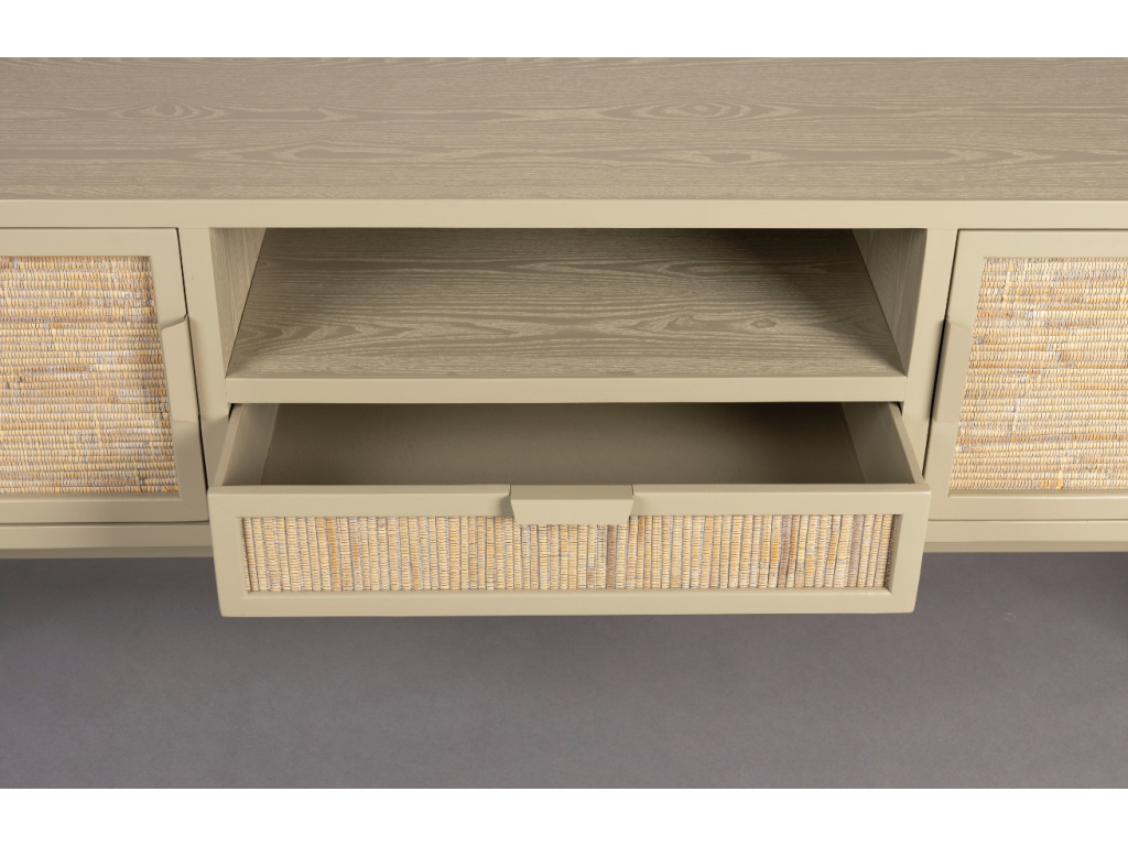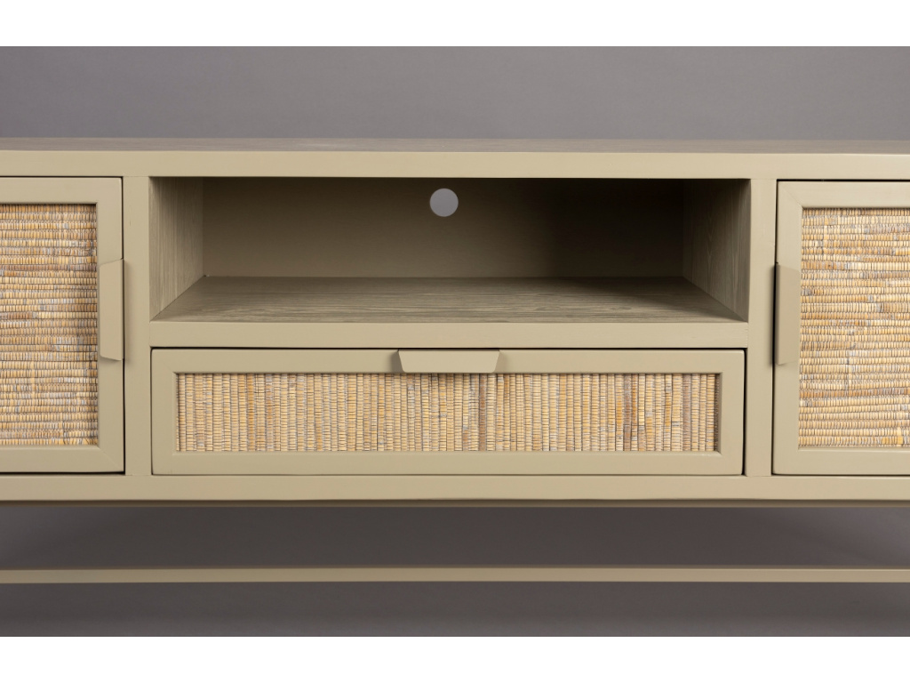 TV stolek YASU od holandské značky DUTCHBONE zaujme svým originálním designem. Je vyroben z lakované dýhy z čínské jedle s dekorem z ratanového výpletu, což dodává stolku nádech exotiky. Stabilitu zajišťuje minimalistická kovová podnož stejné barvy jako korpus. YASU nabízí dostatek úložného prostoru na oblíbené časopisy, knihy a elektroniku. Zadní strana stolku je opatřena praktickým otvorem, kterým snadno vyvedete všechny kabely.