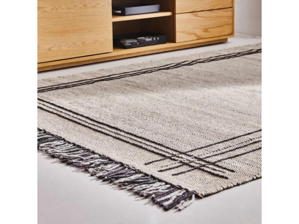 Obohaťte svůj interiér originálním vlněným kobercem Eneo značky Kave Home. Je vyrobený ze směsi vlny, bavlny a polyesteru, díky čemuž vám poskytne příjemný a hřejivý pocit pod nohama. Jeho texturovaný povrch a jedinečný design v neutrálních barvách, který je doplněn o tmavě hnědé pruhy, vám vnesou do prostoru útulnou atmosféru. Bude se skvěle hodit do rustikálních a přírodně laděných interiérů.