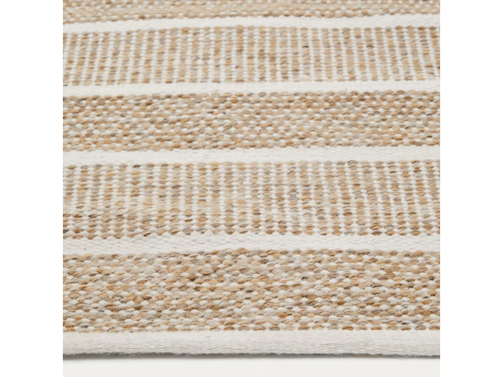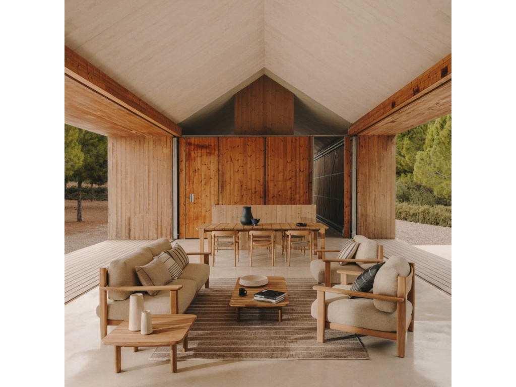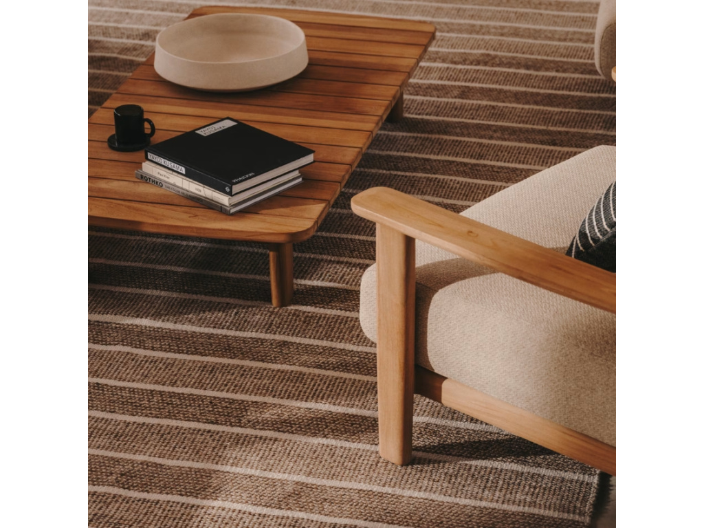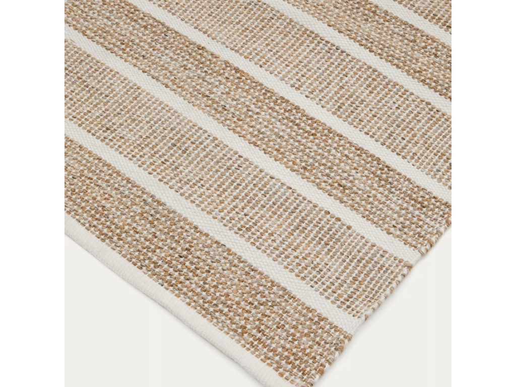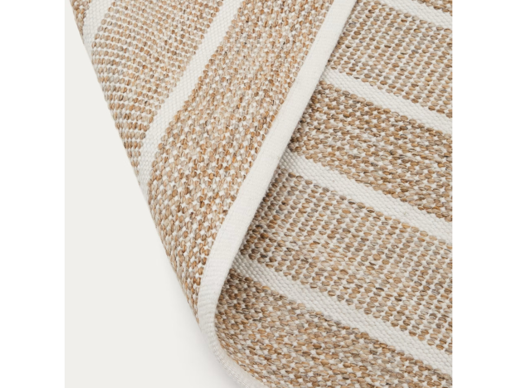 Posezení na vaší terase či zahradě skvěle doplní pruhovaný koberec Kave Home Desni. Je tkaný ručně a na jeho výrobu bylo použito recyklované PET vlákno, které představuje skvělý způsob zužitkováni použitých PET lahví. Desni bude vypadat dobře například v kombinaci z nábytkem z masivního dřeva – pokud zrovna vybíráte také zahradní nábytek, doporučujeme prohlédnout si sérii Tirant, která je zachycena na interiérových fotkách.