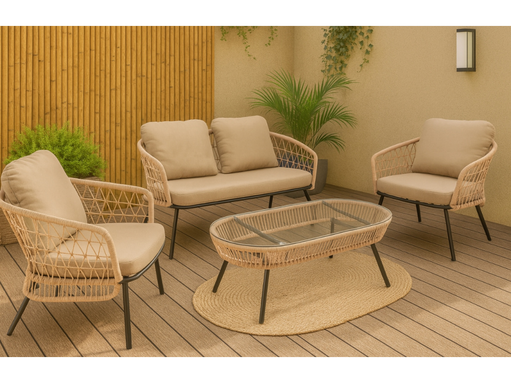 Zahradní set Odesa spojuje středomořský šarm a moderní vzhled, který je odolný i nadčasový. Sestava obsahuje dvě pohodlná křesla, dvoumístnou pohovku a elegantní konferenční stolek s 5mm tvrzeným sklem. Béžový výplet ze syntetické šňůry navinutý na černé pozinkované konstrukci působí lehce, vzdušně a útulně. Béžové sedáky a polštáře, které jsou odolné vůči venkovnímu použití, zajišťují maximální komfort.
