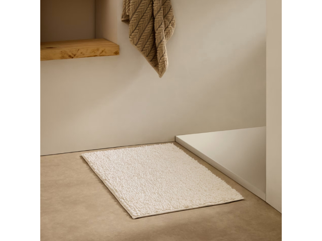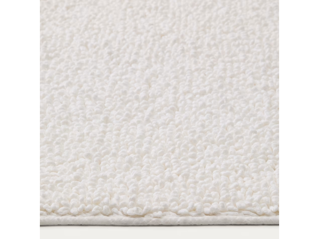 Koupelnová předložka Kave Home Uvite se pyšní strukturou připomínající bouclé. Ať už ji umístíte před toaletu, sprchový kout nebo vanu, vždy zajistí měkký a příjemný prostor pro vaše chodidla a díky vysoké savosti spolehlivě absorbuje veškerou vodu. Doplňte ji dalšími koupelnovými doplňky značky Kave Home a proměňte vaši koupelnu v útulné a designové místo!