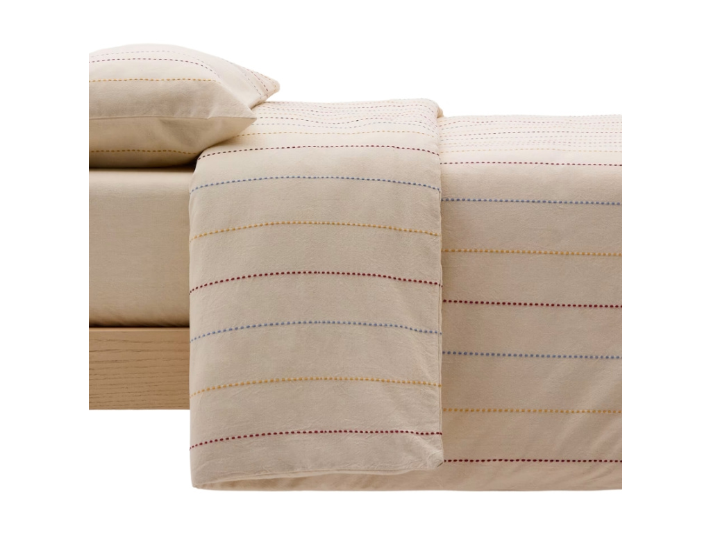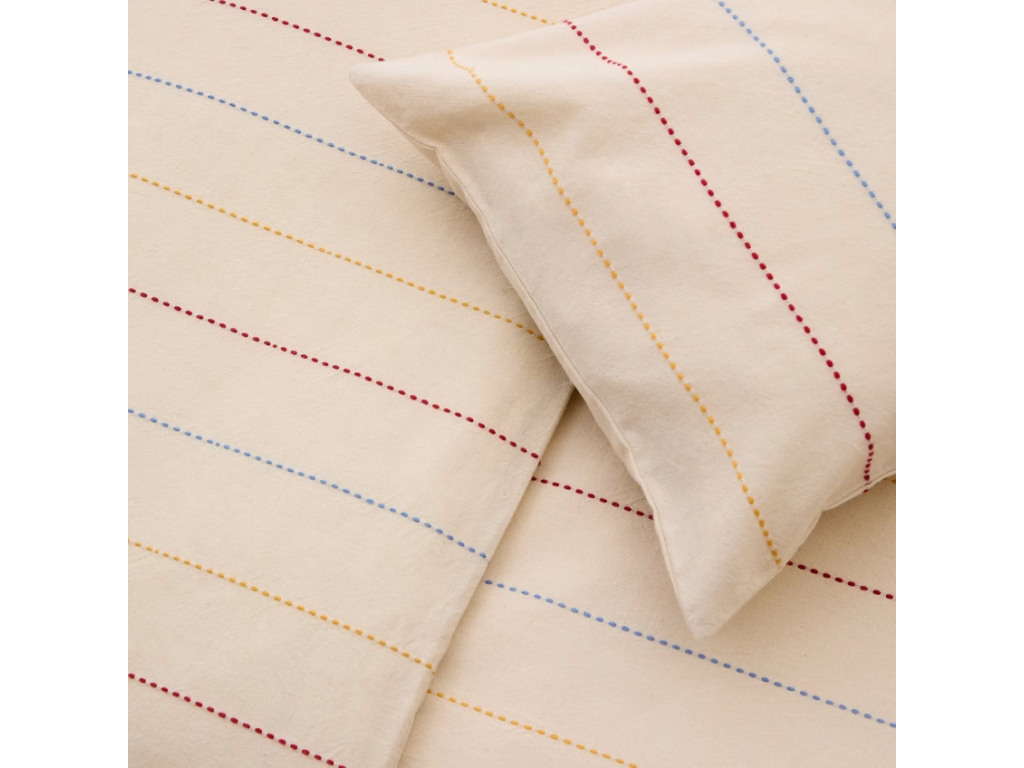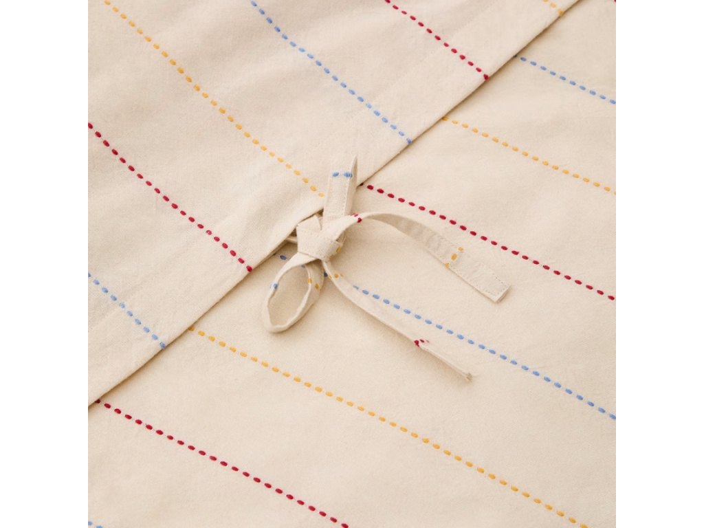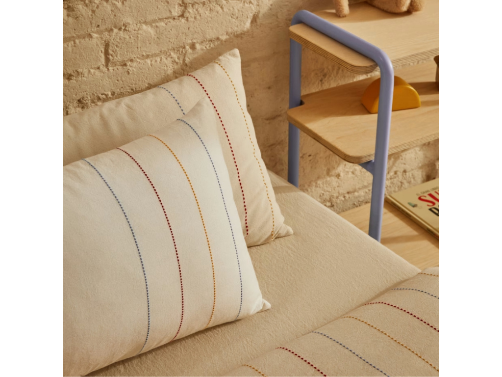 Krémově bílá sada dětského povlečení Kave Home Indani je stvořena pro sny plné fantazie a dobrodružství. Sada je vhodná na matraci 70 x 140 cm a obsahuje jeden povlak na peřinu, jeden povlak na polštář a jedno prostěradlo. Jemný organický bavlněný materiál zaručuje maximální pohodlí a šetrnost k citlivé dětské pokožce. Vícebarevná pruhovaná výšivka dodává povlečení hravý vzhled, který rozzáří každý dětský pokojík. Sada je k dostupná také v rozměrech 90 x 190 cm.