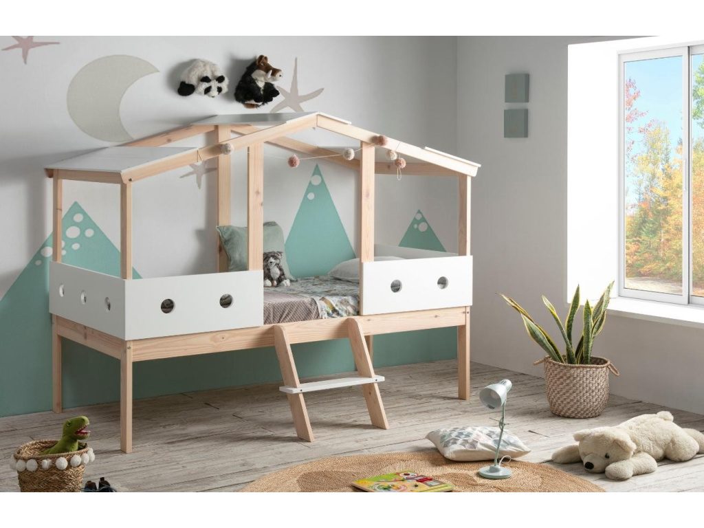 Dětská vyvýšená postel Compte zaujme svým hravým designem. Rám z borovicového dřeva tvoří tvar domu včetně zčásti kryté střechy - můžete využít k zavěšení různých dekorací. Součástí jsou také prakticky umístěné desky, které tak zamezí pádu dítěte. Dopřejte vaší ratolesti radost v podobě originální a zábavné postele od značky Marckeric.