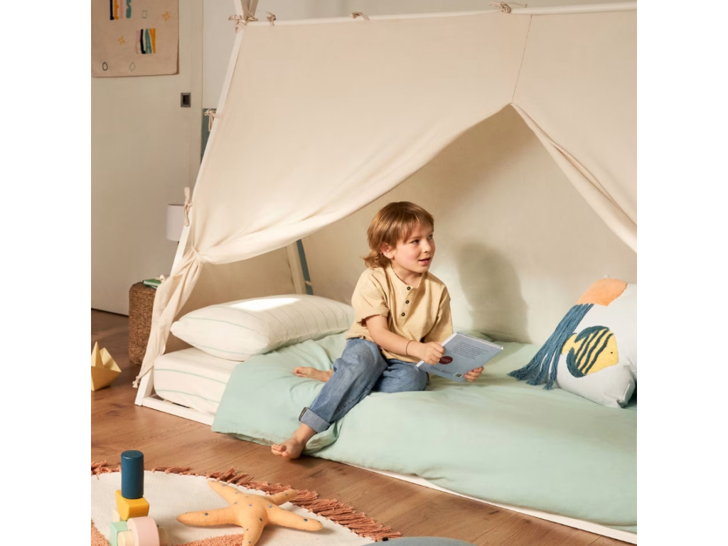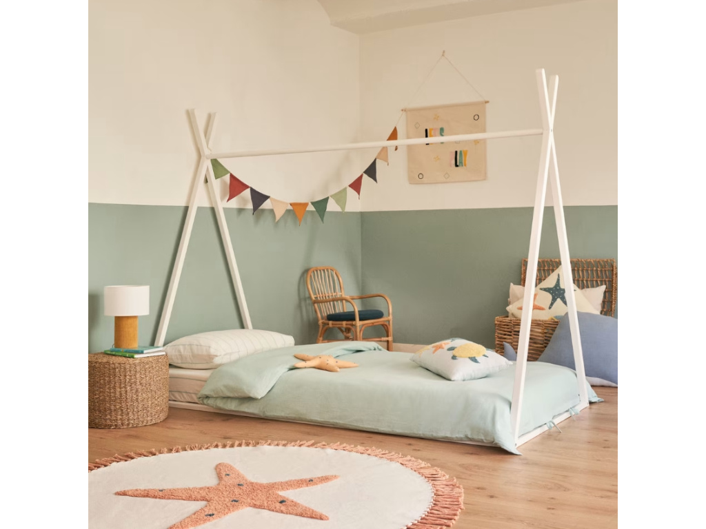 Dětská postel z bíle lakovaného bukového dřeva Kave Home Maralis má tvar indiánského teepee. Hravou podobu postele si na první pohled zamiluje každá dětská duše. Její konstrukce může být využita například k zavěšení LED světýlek a nejrůznějších dekorací, čímž můžete dětský pokoj skvěle zútulnit. Díky neutrální barvě postel bez problému zakomponujete do interiérů všech barev. Dostupná je také v menším provedení pro rozměr matrace 70 x 140 cm. K posteli můžete dokoupit béžový baldachýn, se kterým se postel promění v perfektní úkryt.