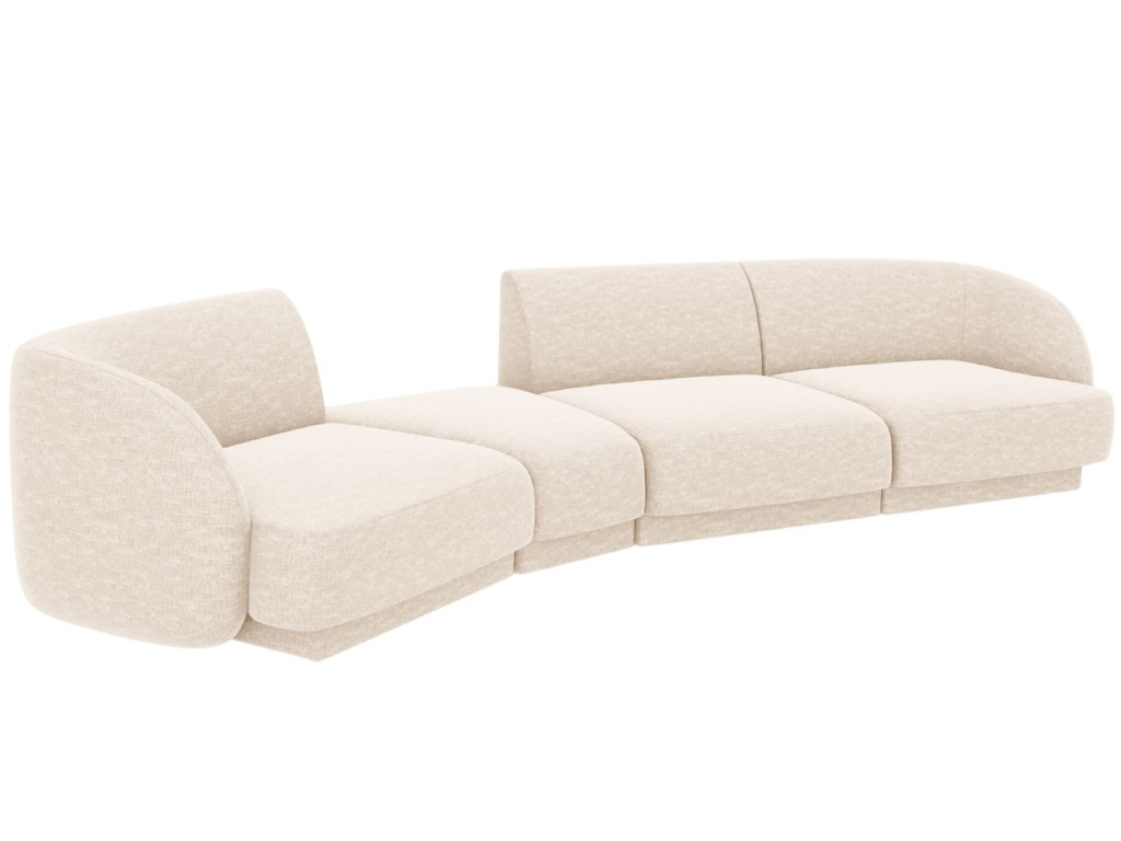 Čtyřmístnou pohovku Miley od značky Micadoni si zamilujete!Její elegantně obloukovité opěradlo vás doslova zve k odpočinku, zatímco jemně zapuštěná základna dodává celému kusu vzdušnost a lehkost. Žinylková potahová látka je velmi příjemná až téměř hedvábná na dotek. Probarvené nitě vytvářejí poutavou 3D strukturu se stínovým a lesklým efektem. Tkanina je velmi odolná proti oděru, díky tomu je pohovka vhodná i do komerčních prostor. Vysoká kvalita a neobyčejný vzhled látky dodávají nábytku sofistikovaný dojem, který umožňuje jeho široké využití v moderním nebo skandinávském stylu. Integrovaný konferenční stolek je nejen designovým prvkem, ale také praktickým místem pro odložení věcí, které chcete mít po ruce, nebo pro umístění dekorací. K pohovce je možné přikoupit další produkty z kolekce Miley. Díky tomu si můžete vytvořit sedací soupravu, kterou je vhodné kombinovat se skleněným nebo dřevěným konferenčním stolkem.