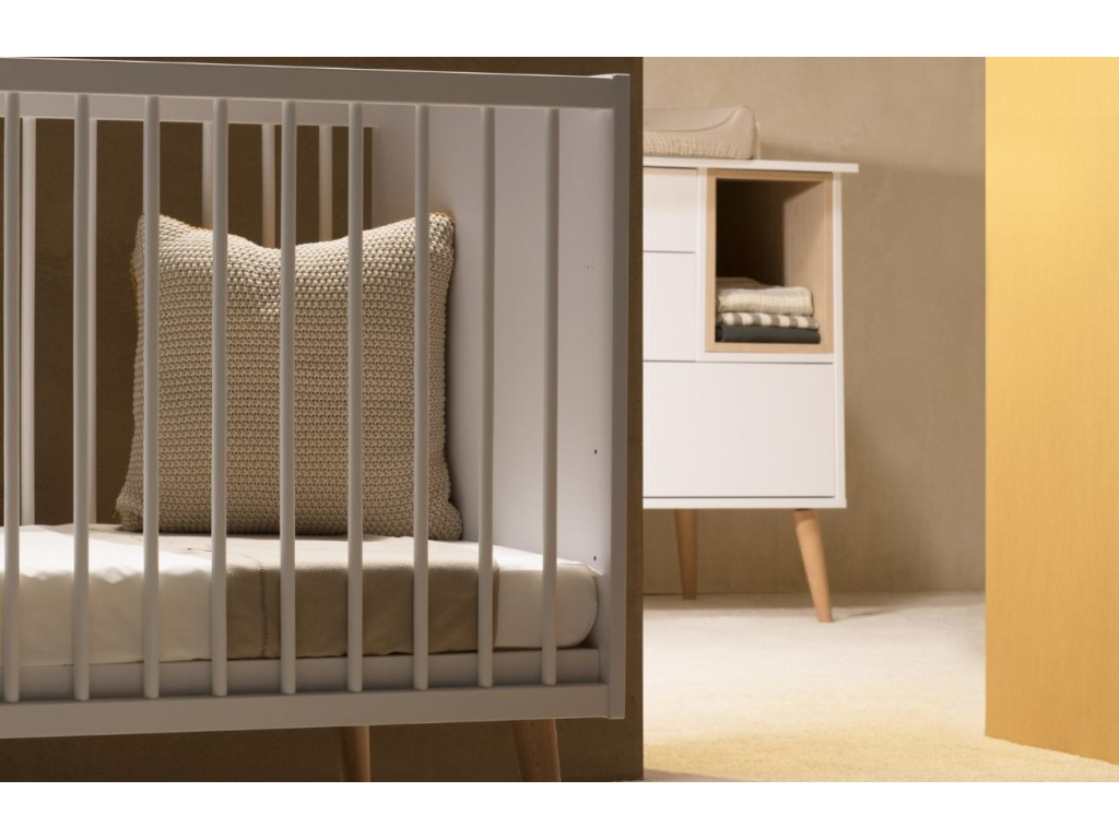 Postýlka Cocoon je ze stejnojmenné řady nábytku od značky Quax. Krásný minimalistický design zaujme na první pohled. Praktický a funkční nábytek do dětského pokoje vyrobený z laminátu s masivní bukovou podnoží je elegantním řešením pro váš interiér. Jemný a vzdušný kontrast se skvěle hodí do skandinávských interiérů s dalšími prvky z řady Cocoon, tím vytvoříte dokonalou souhru v každém prostoru. Do postýlky doporučujeme pohodlnou matraci Quax, která zaručí klidný spánek.