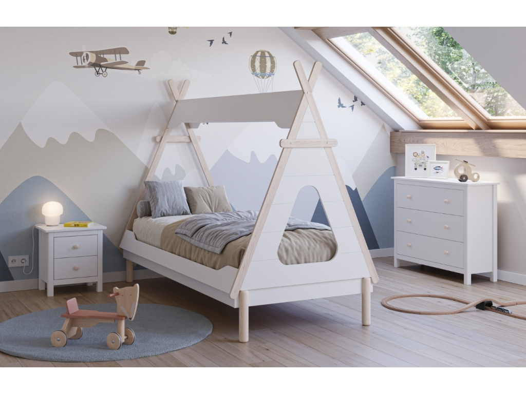 Postel Nora od značky Marckeric vnese do dětského pokoje hravý styl a kouzlo skandinávského designu. Její tvar připomínající teepee zaujme na první pohled a vytvoří ideální útočiště pro dětské snění i dobrodružství. Kombinace masivního borovicového dřeva a MDF zaručuje stabilitu a dlouhou životnost, zatímco bílý odstín se snadno sladí s jakýmkoli interiérem. Postel je dostupná ve 2 barvách a celá kolekce Nora nabízí i další varianty pro různé věkové kategorie.