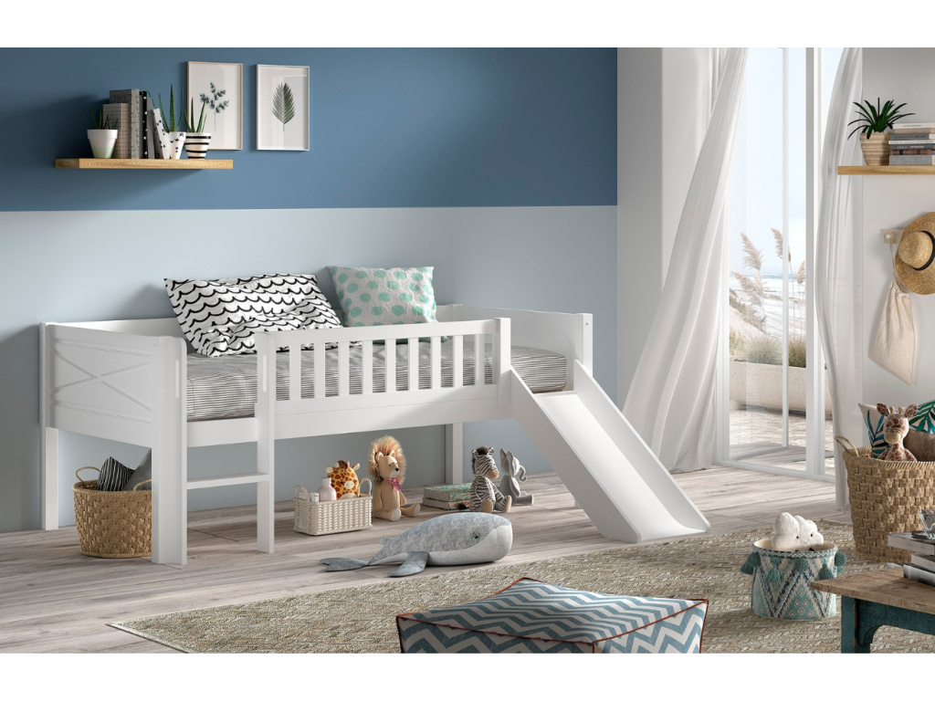 Dětská postel Scott v elegantní bílé barvě je ideálním řešením pro malé dobrodruhy a jejich rodiče, kteří kladou důraz na praktičnost. Díky zvýšené konstrukci a žebříku nabízí nejen pohodlné spaní, ale i prostor pro úložné boxy. Navíc je doplněna o skluzavku, která promění každý den v zábavné dobrodružství – ať už ranní vstávání, či odpoledne plné her. Robustní provedení z borovicového dřeva zajišťuje stabilitu a bezpečnost, zatímco celá kolekce Scott od Vipack nabízí možnost doladit dětský pokoj do posledního detailu.