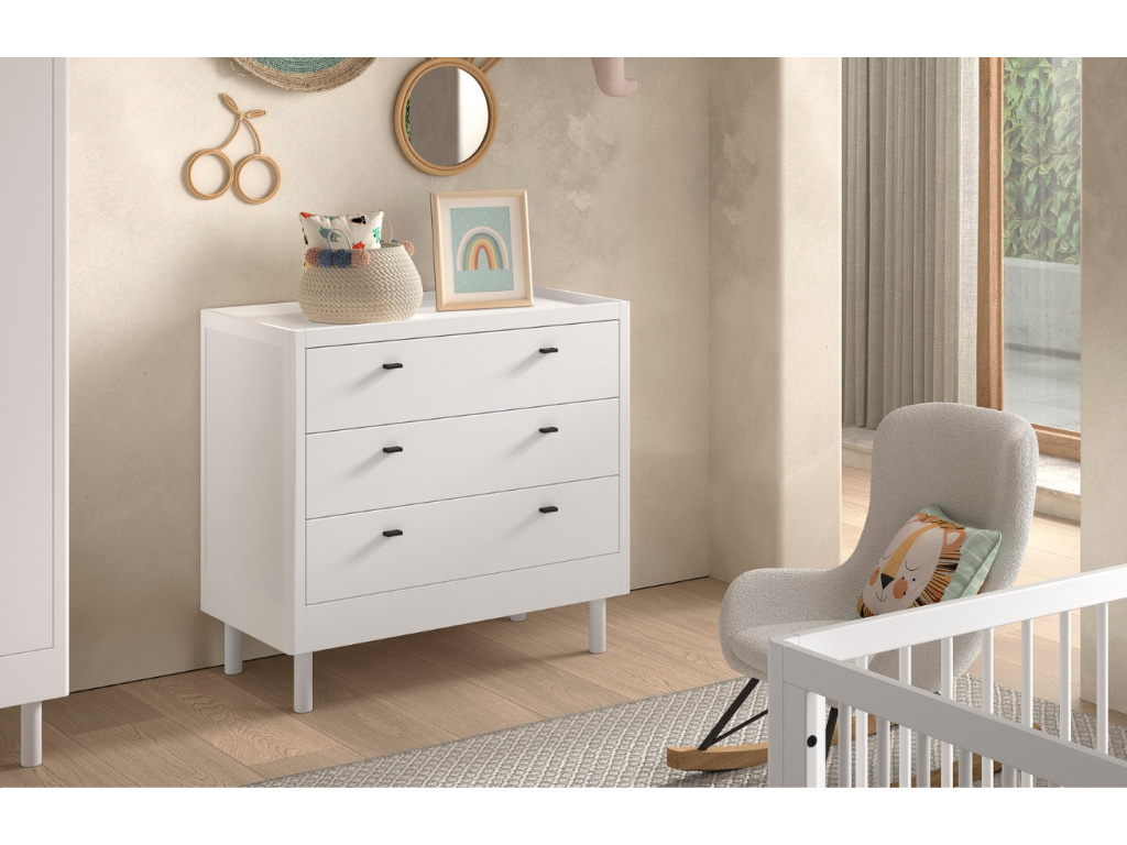 Komoda Forrest z kvalitního evropského buku nabízí tři prostorné zásuvky, které díky soft-close systému zavíráte tiše a bez námahy. Bílá lakovaná úprava působí elegantně a nadčasově, takže snadno zapadne do různě laděných dětských pokojíků. Masivní konstrukce slibuje stabilitu a výdrž, takže vám nábytek bude sloužit po mnoho let. Doporučujeme ji zkombinovat s dalšími kousky z kolekce Forrest, s nimiž snadno vytvoříte harmonický a funkční dětský pokojík.