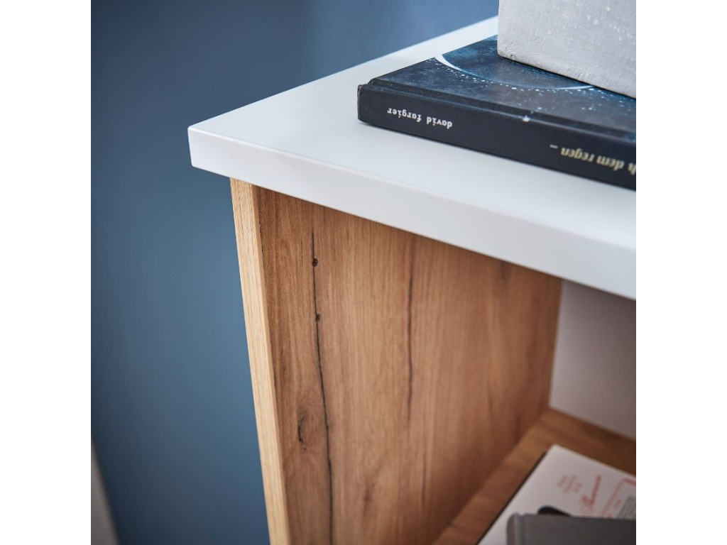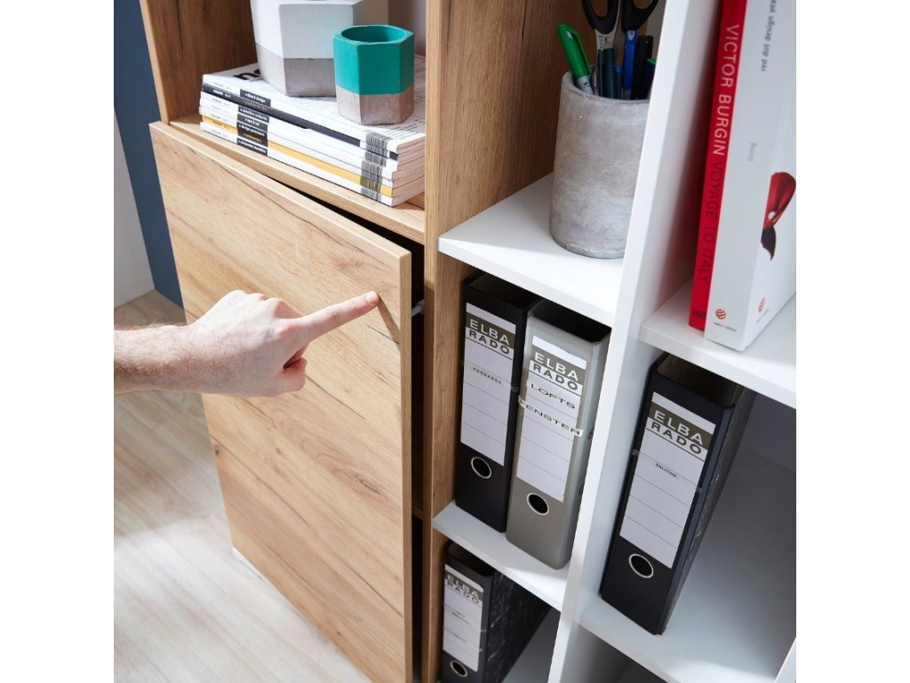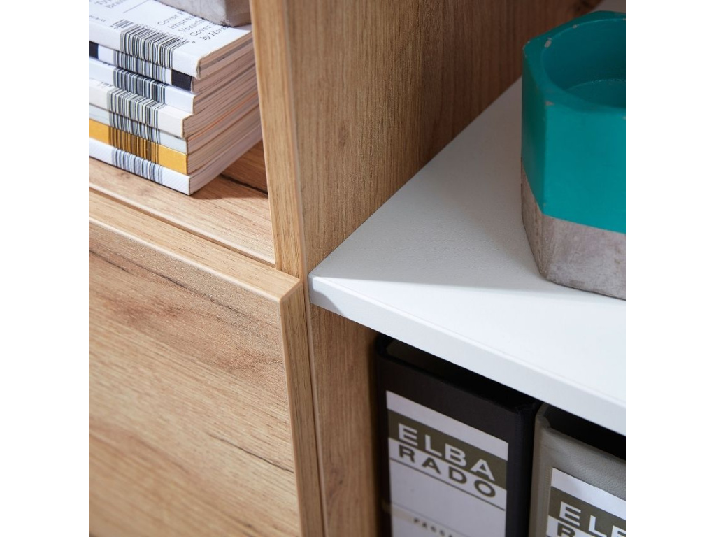 Moderní kancelářská skříň Lioni od značky GERMANIA je inspirovaná severským stylem. Kombinace bílé a přírodní barvy laminátového korpusu vytváří jemný a čistý vzhled, který do vašeho interiéru vnese nádech minimalistického designu. Prostorné úložiště zajišťuje nika s 11 otevřenými přihrádkami a 5 uzavřených polic za dvířky, díky čemuž pohodlně uložíte velké množství všeho inventáře. Dvířka s technologií push-to-open poskytují ochranu soukromí pro důvěrné dokumenty, zatímco otevřené police poskytují rychlý přístup k často používaným předmětům. Povrchová úprava skříňky z melaminové pryskyřice poskytuje nárazuvzdorný a vlhkosti odolný povrch. Díky nárazuvzdorným ABS hranám máte vyšší jistotu odolnosti.  Doporučujeme kombinace všech produktů z řady Lioni.