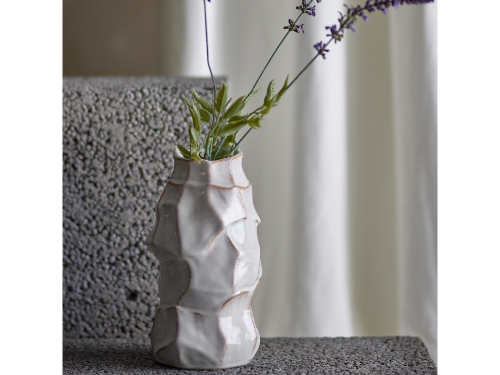 Váza Dolores od Bloomingville připomíná sochařské umělecké dílo a pyšní se zvlněnými okraji. Bílá glazura s detaily v tmavších odstínech doplňuje organický tvar a dodává klasickému vzhledu moderní nádech. Ať už je použita samostatně nebo spolu s dalšími dekoracemi, bude se váza jednoznačně vyjímat a dodá místnosti uměleckou atmosféru.