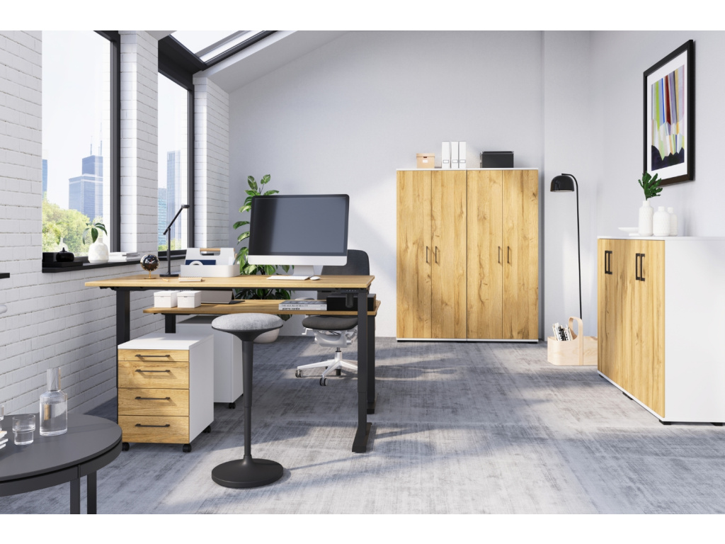 Kancelářská skříň Profi 2.0 od značky Germania spojuje moderní vzhled, precizní zpracování a dlouhou životnost – zkrátka kvalitu, na kterou se můžete spolehnout každý den. Elegantní kombinace bílého dekoru s přírodním dubem Grandson vytváří harmonický celek, který působí moderně a zároveň útulně – přesně tak, jak si představujeme ideální kancelář nebo domácí pracovnu. Povrchová úprava z melaminové pryskyřice chrání korpus před poškrábáním a vlhkostí, zatímco kvalitní ABS hrany zaručují, že si skříň zachová svůj vzhled po dlouhá léta. Za minimalistickým designem se skrývá promyšleně uspořádaný úložný prostor, který nabízí dostatek místa pro šanony, dokumenty i kancelářské doplňky. Díky několika barevným variantám si můžete zvolit provedení, které nejlépe vystihne atmosféru vašeho pracovního prostoru. Profi 2.0 tak spojuje praktičnost s elegancí a vytváří prostředí, ve kterém se snadno pracuje i dýchá.