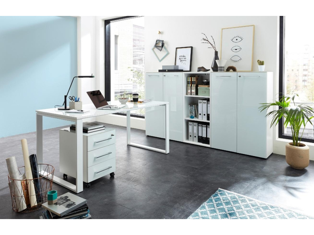 Moderní kancelářská komoda Monteria od značky GERMANIA je perfektním kouskem do vaší kanceláře. Jednoduchá, bílá barva laminátového korpusu ve vysokém lesku vytváří jemný a čistý vzhled, který do vašeho interiéru vnese nádech minimalistického designu. Přední stranu zdobí tvrzené sklo. Prostorné úložiště zajišťují 3 police, díky čemuž pohodlně uložíte velké množství všeho inventáře. Celý design podtrhnou kovové úchytky v chromované barvě. Povrchová úprava korpusu z melaminové pryskyřice poskytuje nárazuvzdorný a vlhkosti odolný povrch. Příjemným bonusem je možnost skříňku uzamknout a ochránit tak vaše důležité dokumenty. Díky nárazuvzdorným ABS hranám máte vyšší jistotu odolnosti, díky čemuž se skvěle hodí nejen do komerčních prostor, ale také do domácích pracoven. Doporučujeme kombinace všech produktů z řady Monteria.
