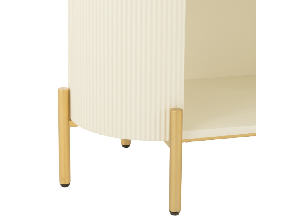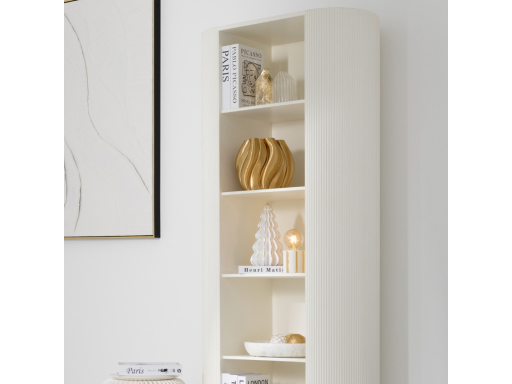 Knihovna Marry vyniká elegantním designem, který okouzlí na první pohled. Její jemně zaoblené linie působí moderně a zároveň přinášejí do interiéru pocit harmonie. Prostorné police umožní vystavit oblíbené knihy, dekorace či rostliny a tím vytvořit jedinečnou atmosféru domova, zatímco kovová podnož se zlatým povrchem dodává nábytku luxusní nádech. Světlý odstín knihovny krásně rozjasní prostor a snadno se kombinuje se skandinávským minimalismem, moderním glamour stylem i útulným boho interiérem. Tento kousek se stane nejen praktickým úložným prostorem, ale také elegantní dominantou vašeho interiéru, která dokáže proměnit obývací pokoj, ložnici i pracovnu v útulné místo.