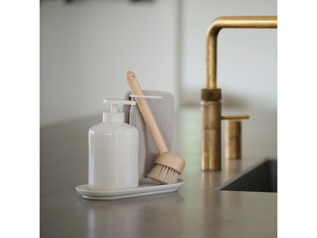 Kuchyňská sada na mytí nádobí Inu přináší dokonalou harmonii estetiky a praktičnosti do moderních kuchyní. Kartáč s dřevěnou rukojetí, elegantní dávkovač na mýdlo nebo saponát, jemný hadřík a silikonový podnos vytvářejí kompaktní celek, který zaujme svým krémově bílým odstínem i minimalistickým designem. Promyšlené detaily, jako kovový držák pro sušení hadříku a odkládání kartáče, podtrhují smysl pro preciznost designérů z NEU Studio, se kterými na tuto kolekci značka Zone Denmark spojila síly.