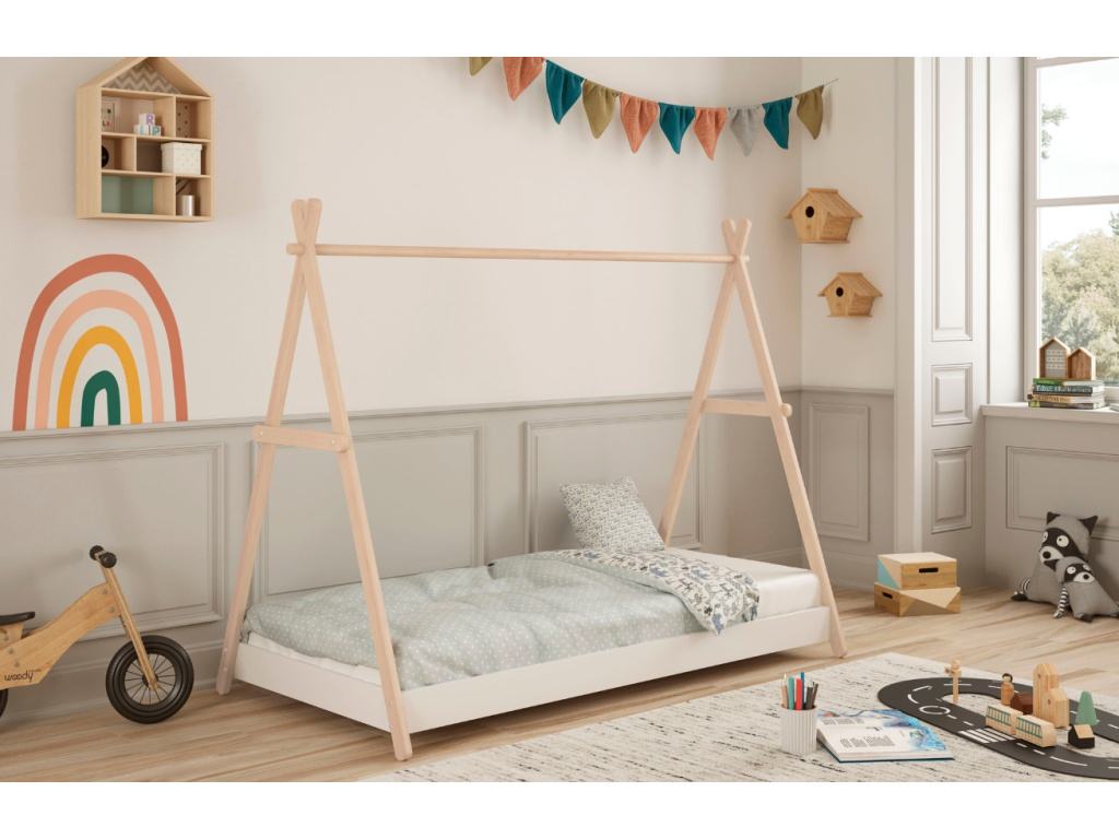Stylová dětská postel Marckeric Trufa vás zaujme na první pohled díky svému hravému designu, který připomíná stan teepee. Konstrukce z borovicového dřeva v kombinaci s materiálem MDF dodá interiéru svěžest a perfektně ho zútulní. Postel se skvěle hodí do dětských pokojů zařízených v rustikálním nebo skandinávském stylu. Velkou výhodou postele Trufa je, že se dá nastavit do dvou poloh - získat tak můžete například nový úložný prostor přímo pod lůžkem.