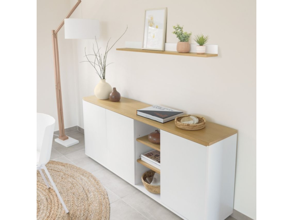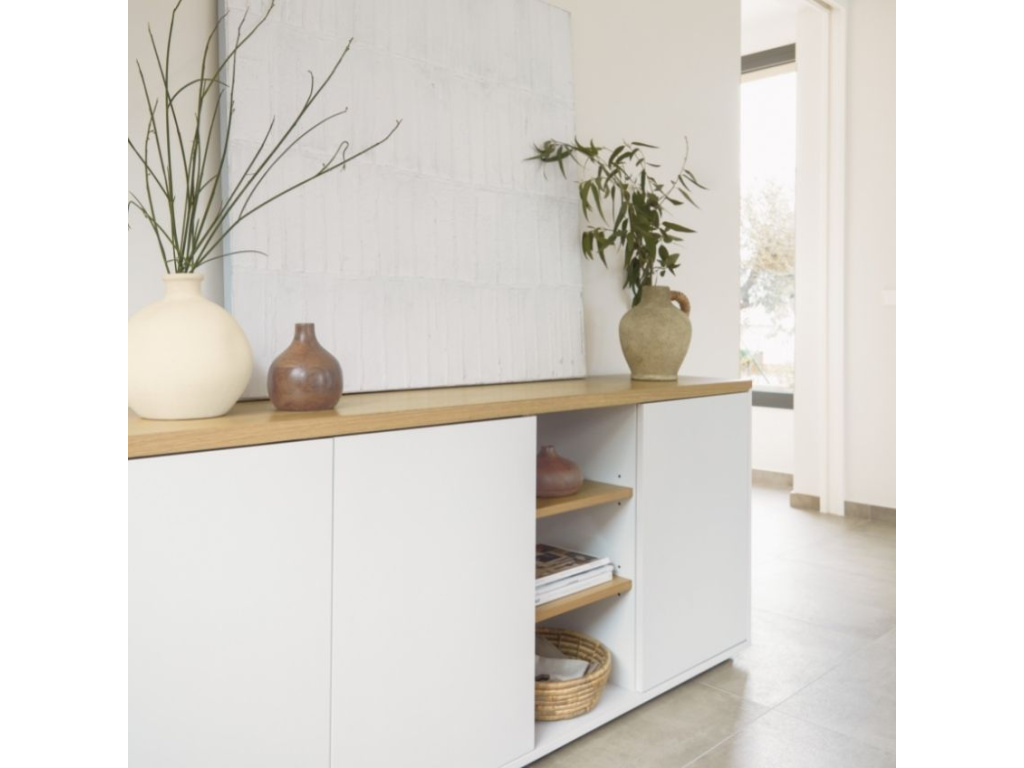 Komoda Abilen od značky Kave Home v bílé barvě s dubovým dekorem se stane jedinečným a stylovým doplňkem vašeho interiéru. Obdélníkový korpus z bíle lakované MDF desky nabízí prostorný úložný prostor díky 4 uzavřeným policím. Atraktivní kontrast dodávají vnější police a horní deska z dubové dýhy, a díky tomu se tato komoda se hodí nejen do moderních, ale i klasických interiérů.
