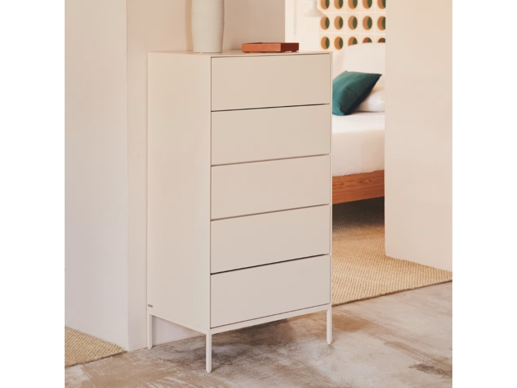 Vysoká komoda Vedrana pochází ze stejnojmenné série nábytku vytvořeného týmem Kave Home. Tyto úložné prostory jsou velice praktické a skvěle se hodí do industriálních i minimalistických interiérů. Spojení bíle lakovaného MDF a světlé kovové podnože je nejen nadčasové, ale hlavně velice elegantní. Tato komoda s vyšší podnoží nabízí úložný prostor v podobě pěti prostorných zásuvek. Ty se budou skvěle hodit například ke zorganizování oblečení a spodního prádla Sjednoťte úložné prostory ve vaší domácnosti a vpusťte do ní sérii Vedrana! Vybírat můžete z komod a TV stolků různých velikostí, všechny jsou dostupné nejen v bíle lakovaném provedení, ale také v provedení dub a ořech.