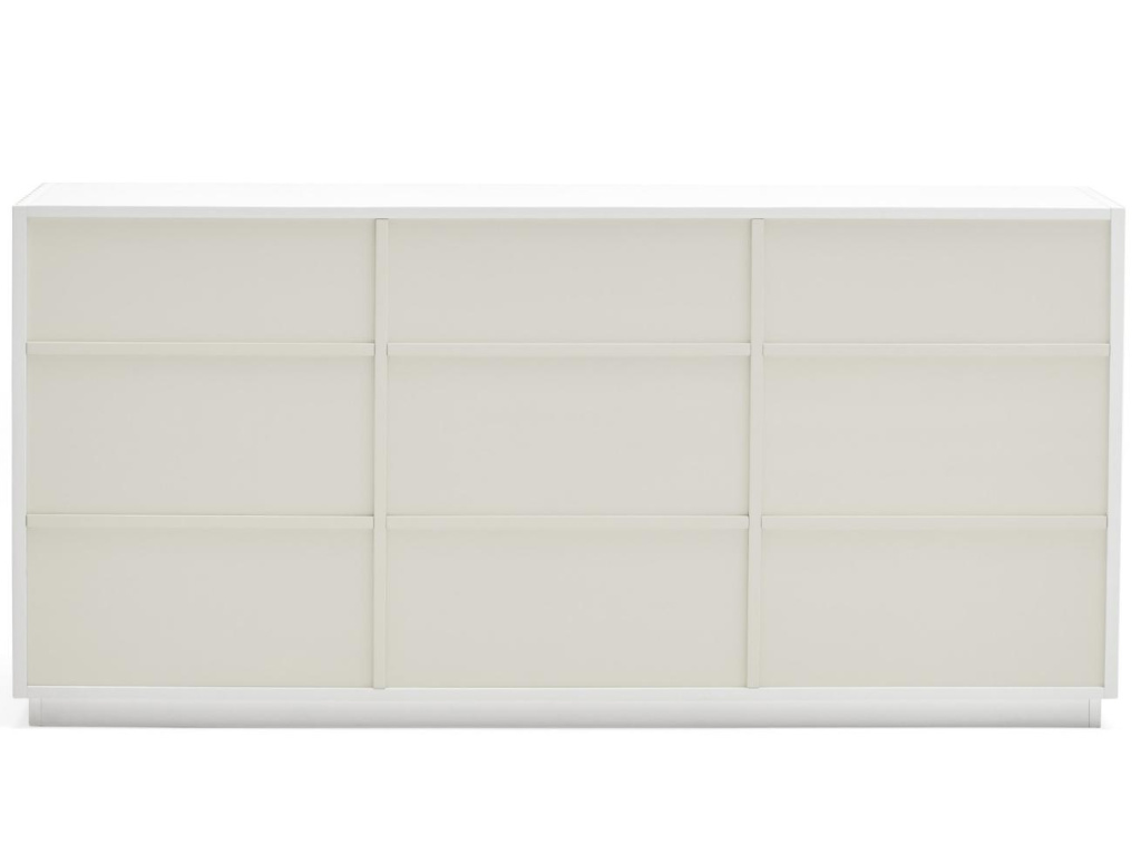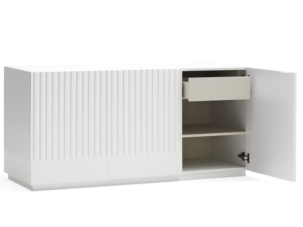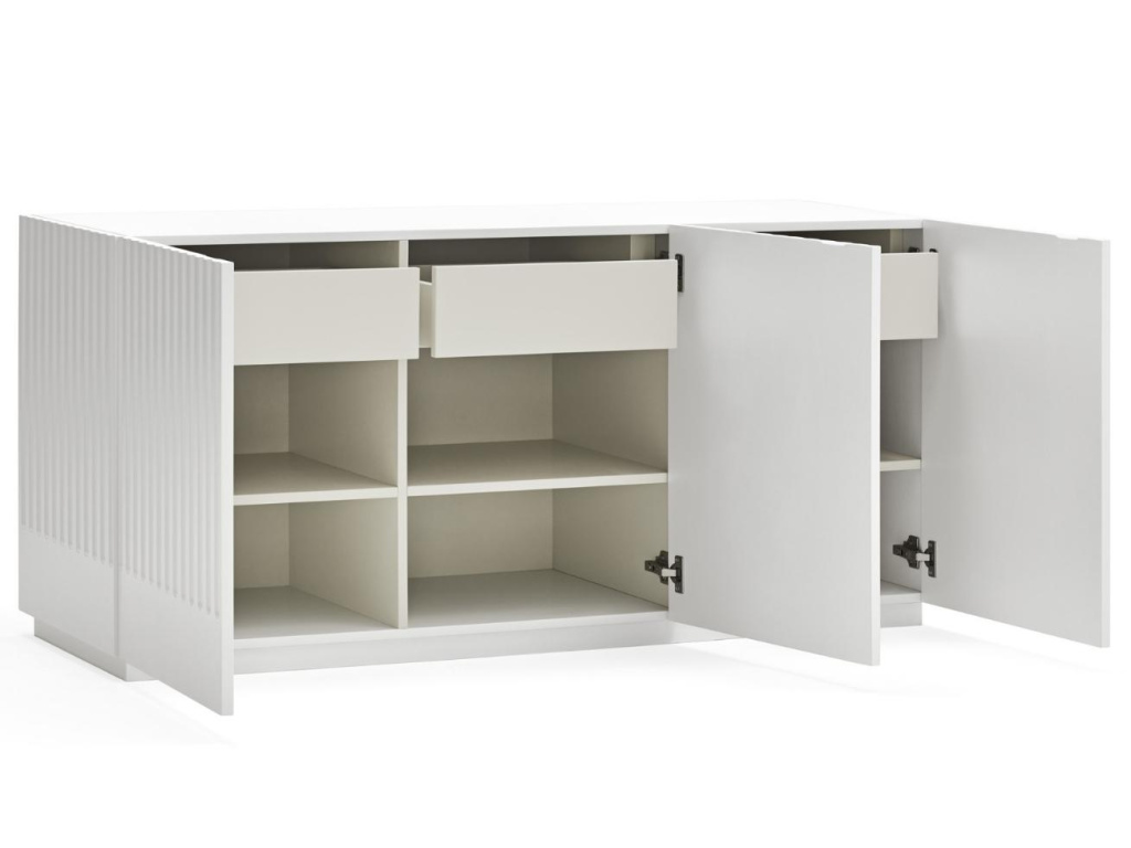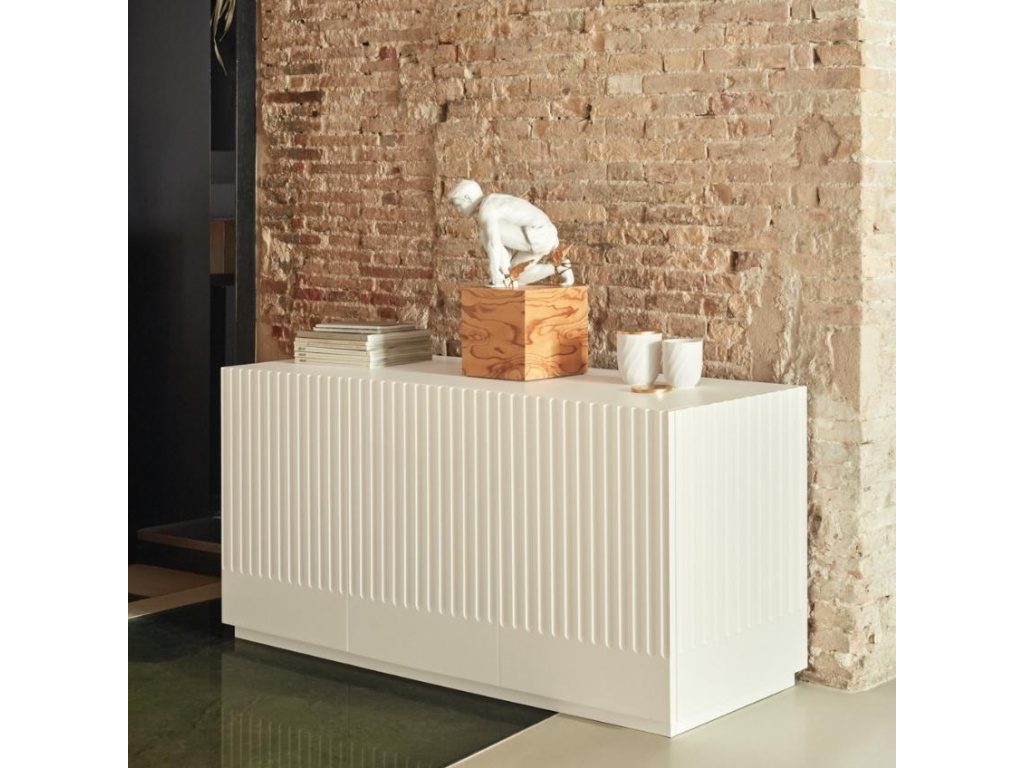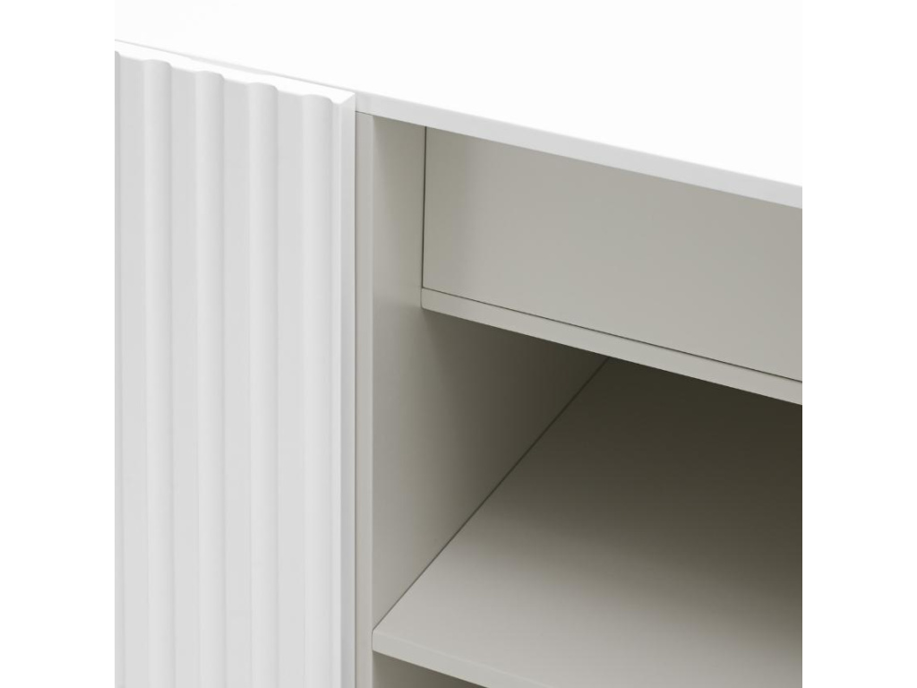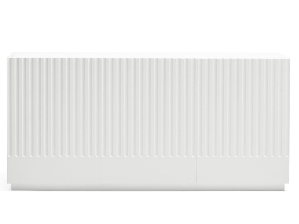 Minimalistická komoda Teulat Doric se díky svému nadčasovému designu stane ideálním doplňkem každého moderního interiéru. Ať už se rozhodnete umístit ji do ložnice či obývacího pokoje, dokonale vám poslouží. Zajímavým designovým prvkem je vzorek na předních dvířkách a po stranách, který nábytku dodává na osobitosti a stylu. Komoda je vyrobena z lakovaného MDF v elegantní bílé barvě. Disponuje praktickým úložným prostorem ve formě osmi uzavřených polic a čtyř zásuvek.