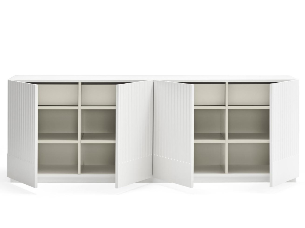 Minimalistická komoda Teulat Doric se díky svému nadčasovému designu stane ideálním doplňkem každého moderního interiéru. Ať už se rozhodnete umístit ji do ložnice či obývacího pokoje, dokonale vám poslouží. Zajímavým designovým prvkem je vzorek na předních dvířkách a po stranách, který nábytku dodává na osobitosti a stylu. Komoda je vyrobena z lakovaného MDF v elegantní bílé barvě. Disponuje praktickým úložným prostorem ve formě osmi uzavřených polic a čtyř zásuvek.