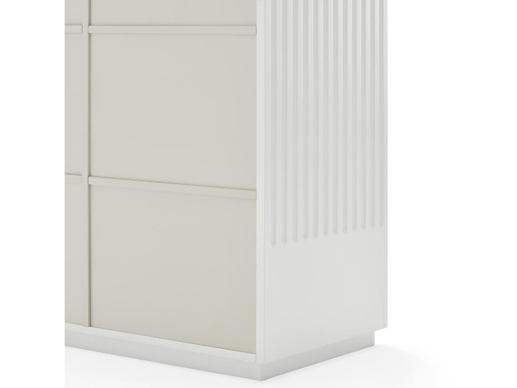 Minimalistická komoda Teulat Doric se díky svému nadčasovému designu stane ideálním doplňkem každého moderního interiéru. Ať už se rozhodnete umístit ji do ložnice či obývacího pokoje, dokonale vám poslouží. Zajímavým designovým prvkem je vzorek na předních dvířkách a po stranách, který nábytku dodává na osobitosti a stylu. Komoda je vyrobena z lakovaného MDF v elegantní bílé barvě. Disponuje praktickým úložným prostorem ve formě osmi uzavřených polic a čtyř zásuvek.