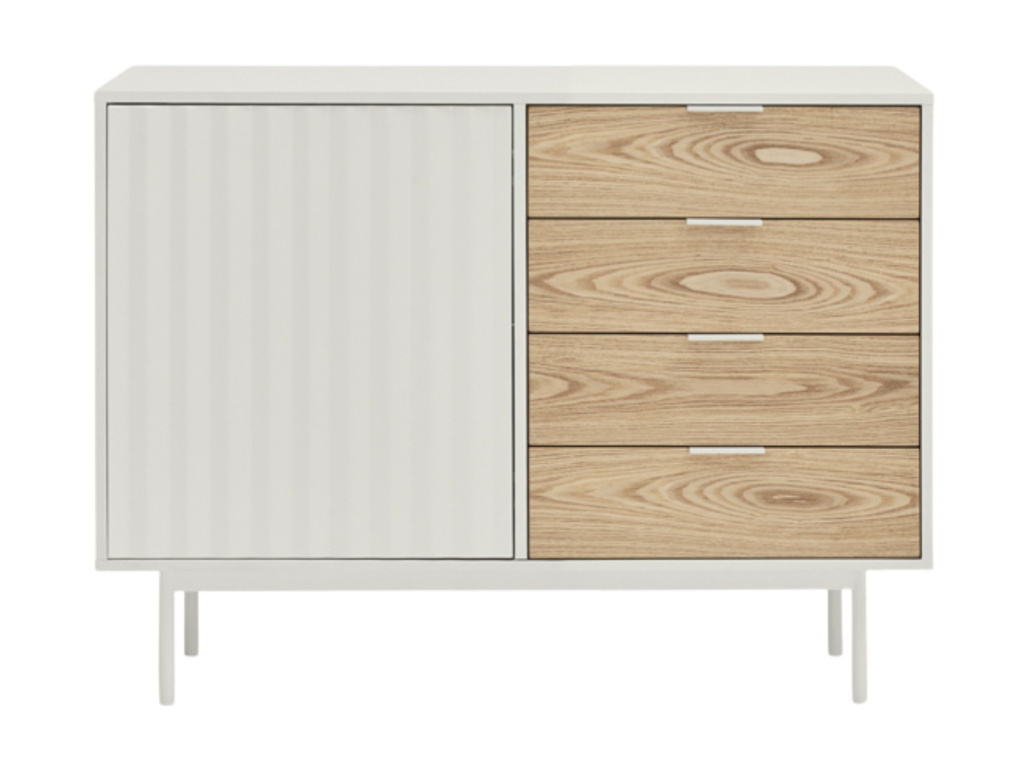 Stylová komoda Teulat Sierra zaujme na první pohled svým minimalistickým designem a harmonikovým vystouplým vzorem na předních dvířkách. Komoda je vyrobena z lakovaného MDF v elegantní bílé barvě, která krásně kontrastuje s přední stranou zásuvek z dubové dýhy. Celý korpus doplňuje tenká kovová podnož. Komoda disponuje praktickým úložným prostorem ve formě uzavřených polic a čtyř zásuvek. Komoda Sierra vynikne zejména v moderně laděných interiérech.