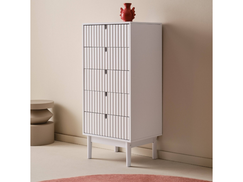Přineste do svého domova styl a praktičnost s komodou TOULUSE od značky Jotex, která se stane nejen užitečným kouskem nábytku, ale také ozdobou vašeho prostoru. Charakteristickým prvkem komody je vlnitý čelní design, který jí dodává nádech elegance a retro stylu. Komoda je vyrobena z borovicového dřeva a MDF, které je navíc ošetřeno ekologickou povrchovou úpravou na vodní bázi, která poskytuje lesklý a hladký povrch, snadno se čistí a je bezpečná pro zdraví vašich dětí. Zároveň se komoda pyšní prestižním certifikátem FSC, což znamená, že při její výrobě bylo použito dřevo pocházející z odpovědně spravovaných lesů, kde se dbá na udržitelnost a ochranu přírody. Komoda TOULUSE nabízí pět prostorných zásuvek, které mají praktický otvor na vrchu pro snadné otevírání. Už nikdy nebudete mít problém s ukládáním oblečení, hraček nebo knih. Vše bude mít své místo, a vy se tak vyhnete nepořádku a chaosu. S TOULUSE získáte dokonalou kombinaci designu a funkčnosti, která obohatí váš domov a poskytne vám praktické řešení pro organizaci vašich věcí. Přidejte ji do svého interiéru a užijte si harmonii elegance a modernosti, kterou přináší.