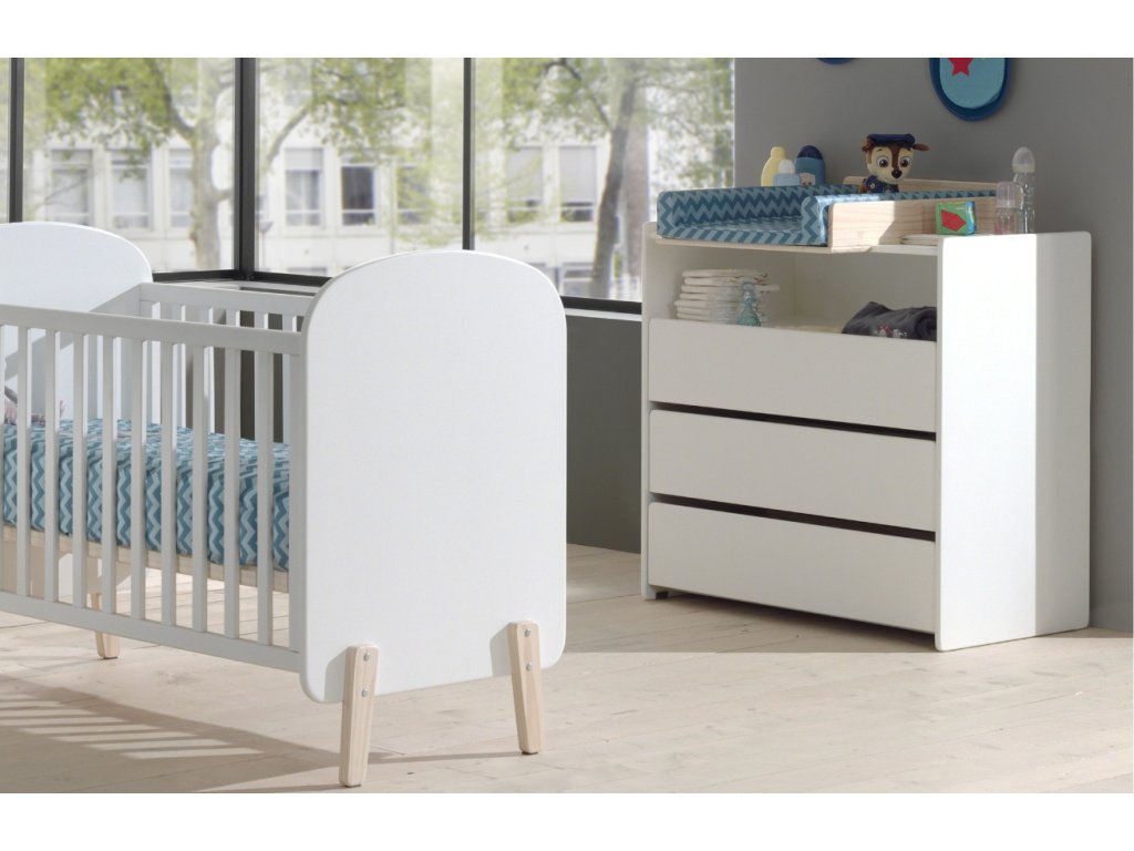 Dřevěná komoda vyrobená z lakovaného MDF zaujme svým jednoduchým funkčním designem. Zaoblené rohy a hladké matné plochy se snoubí v jedinečném skandinávském stylu. Komoda obsahuje tři zavíratelné zásuvky a jednu otevřenou, kam můžete ukládat potřebné věci, knihy či hračky. Díky vyvýšeným bočním stranám komody můžete jednoduše doplnit o přebalovací přihrádku, a rázem máte z komody praktický přebalovací pult. Dětský pokoj můžete také doladit ostatními produkty z kolekce Kiddy, kterou u nás najdete pod značkou Vipack.