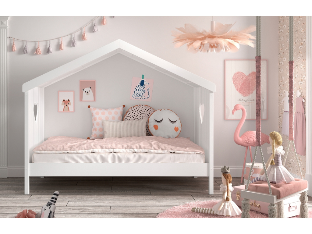 Bíle lakovaná postel Vipack Amori vás nadchne svým výjimečným designem. Postel je stylizovaná do útulného domečku se stříškou, který dětem bude dodávat pocit bezpečí. Okénka ve tvaru srdce dodávají posteli  originalitu a budou vybízet k různým hrám. Nadšené budou především malé princezny, pro které bude postel jejich druhým domovem.