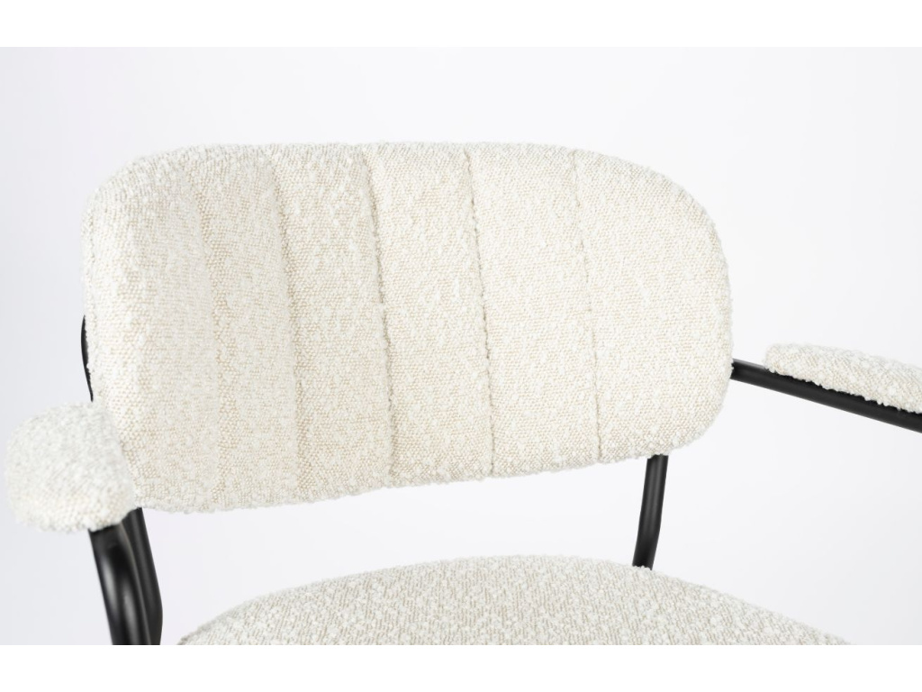 Jídelní židle Jolien s pohodlnými vyššími područkami je čalouněná stále více oblíbenou a velmi atraktivní bouclé látkou. Ta je velice odolná a na první pohled ji poznáte díky drobným uzlíkům, které ozvláštňují její povrch. Skvěle se hodí do skandinávských interiérů, sluší jí to v kombinaci s přírodními materiály. Jolien s sebou přinese k vašemu jídelnímu stolu pohodlí a útulnou atmosféru. Dostupná je také v provedení bez područek.