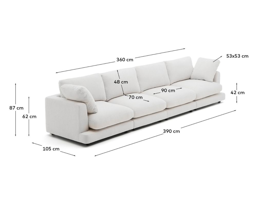 Pohovka Gala značky Kave Home je čalouněna kvalitní žinylkou elegantní bílé barvy. Tato antibakteriální tkanina se snadno čistí, takže se nemusíte bát ani večírků s vínem. Tato čtyřmístná pohovka je jako stvořená pro opravdu prostorné obývací pokoje, do kterých přinese spoustu místa k sezení a hlavně velkou dávku pohodlí. Je dodávána včetně dekorativních polštářů s odnímatelnými oboustrannými potahy, se kterými bude těžké neusnout dokonce i u oblíbeného filmu. Gala vnese do interiéru útulnou atmosféru a pokoj s ní dostane elegantní nádech.