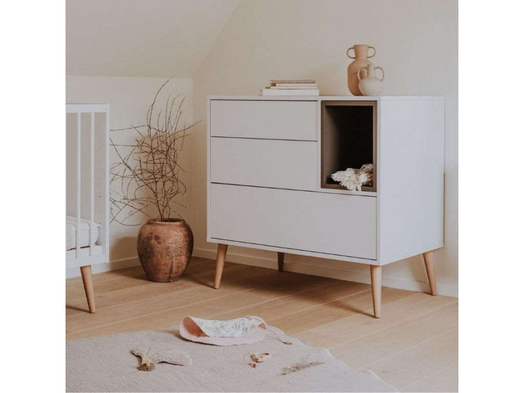 Moderní komoda Quax Cocoon je skvělou volbou do každého dětského pokoje. Moderní přírodní design a velké úložné prostory je ideální kombinace pro každou maminku, která chce mít vše důležité na jednom místě. Plenky, vlhčené ubrousky i oblečení se skvěle schová do tří prostorných zásuvek a poličky. Komodu lze využít samostatně nebo při dokoupení nástavby se z ní rázem stane přebalovací pult. Doporučujeme kombinaci více prvků z řady Cocoon, abyste vytvořili dokonalý kontrast a souhru v interiéru. Komoda Cocoon se skvěle hodí do minimalistických a skandinávských interiérů.