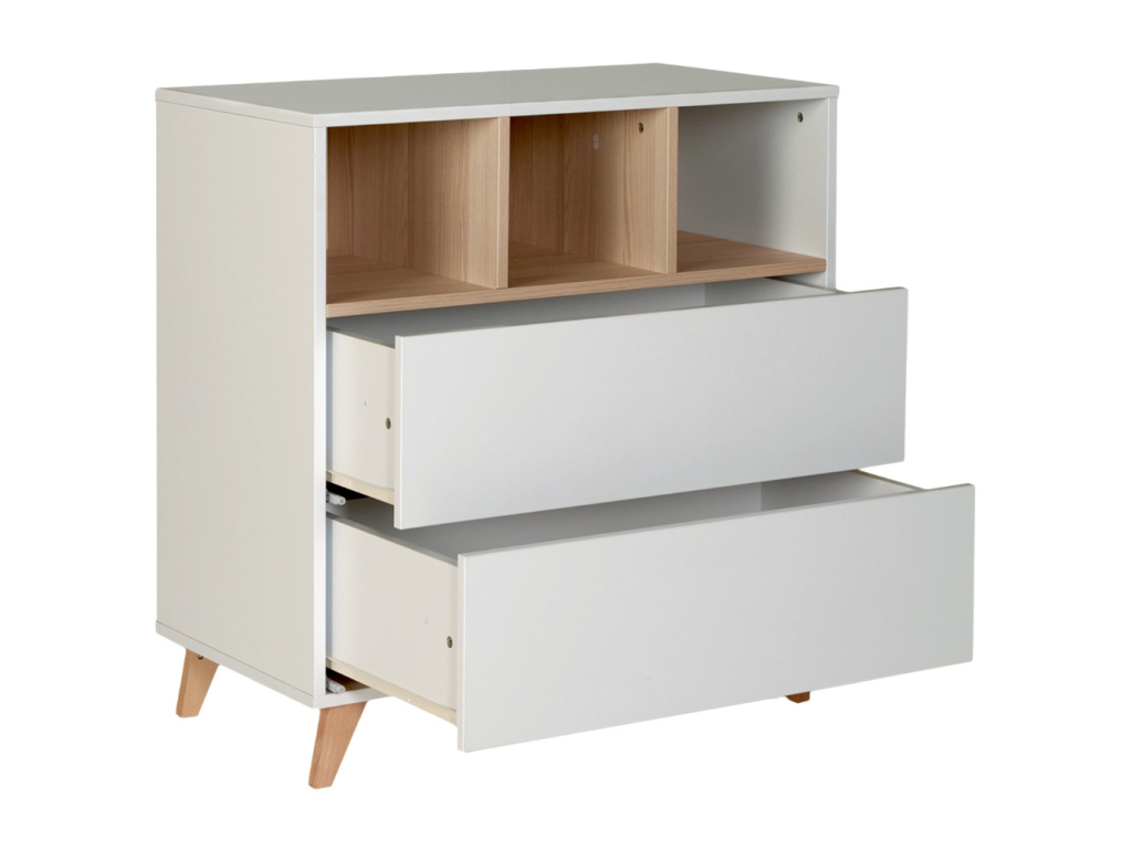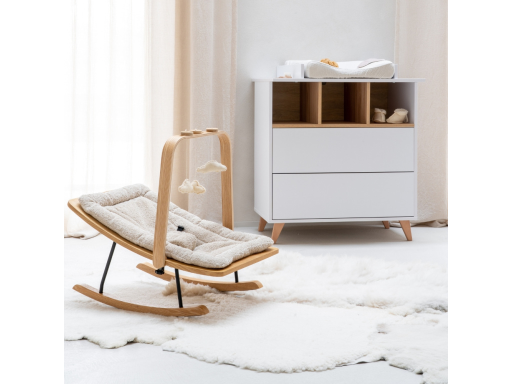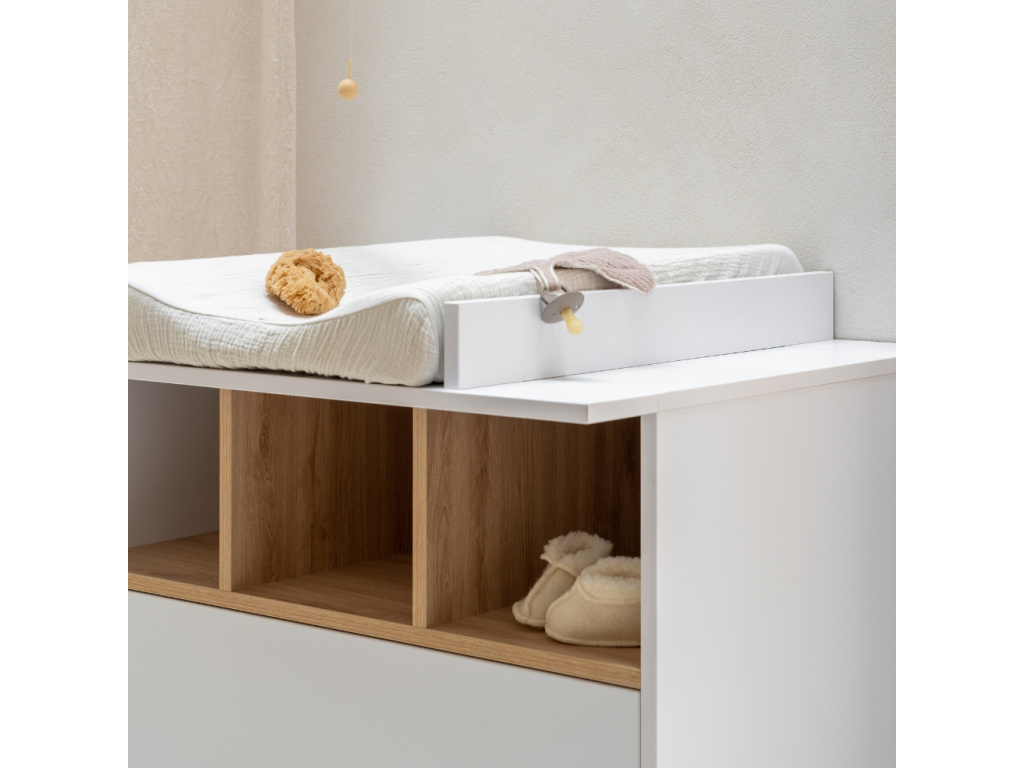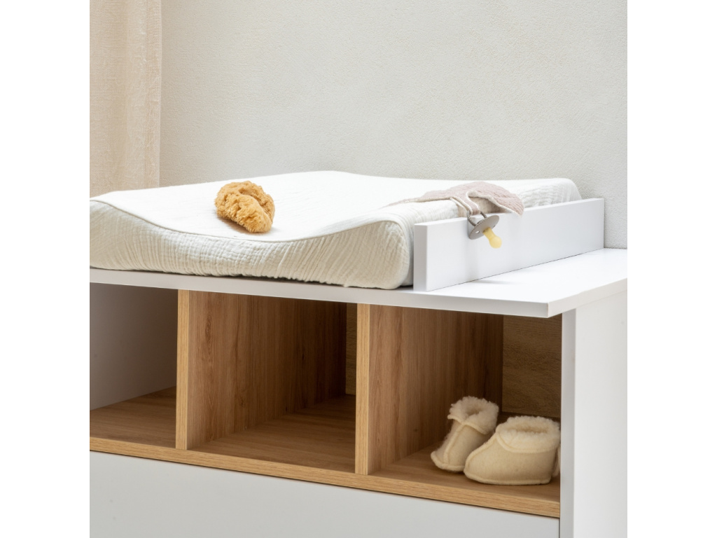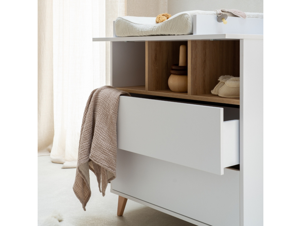 Nedílnou součástí každého pokoje pro miminko je přebalovací pult. Značka Quax přichází s řadou Loft, která vás zaujme nejen svým minimalistickým designem, ale také praktičností a funkčností. Korpus je kompletně vyrobený z laminátu v něžné bílé barvě, která v kombinaci s masivní bukovou podnoží a stejně zbarvenými přihrádkami vytváří jemný a vzdušný kontrast. Komoda disponuje 3 otevřenými přihrádkami pro snadnější přístup k věcem, které potřebujete mít při přebalování po ruce. Dále disponuje 2 prostornými zásuvkami, které bohatě postačí pro uložení oblečení pro vaše miminko. Komodu lze využít samostatně nebo při dokoupení nástavby se z ní rázem stane přebalovací pult. Doporučujeme kombinaci více prvků z řady Loft, abyste vytvořili dokonalý kontrast a souhru v interiéru. Komoda Loft se skvěle hodí do minimalistických či skandinávských interiérů.