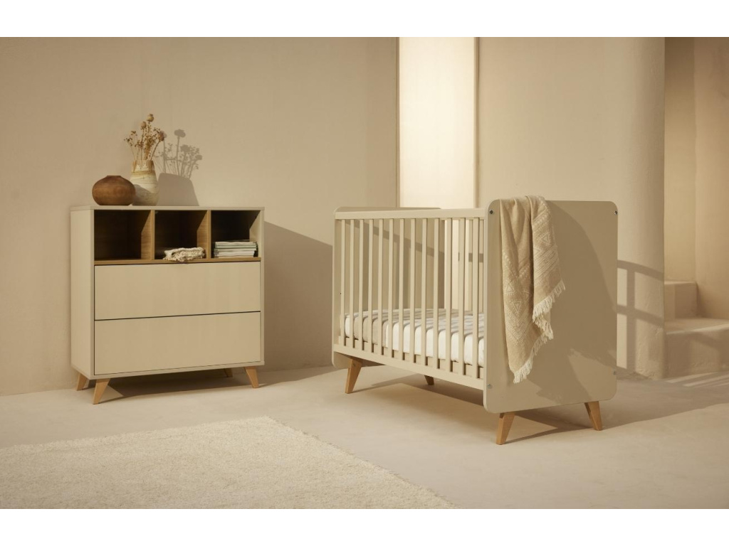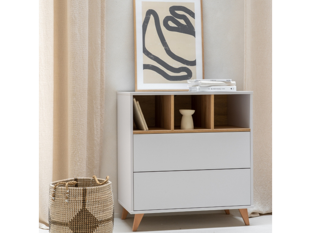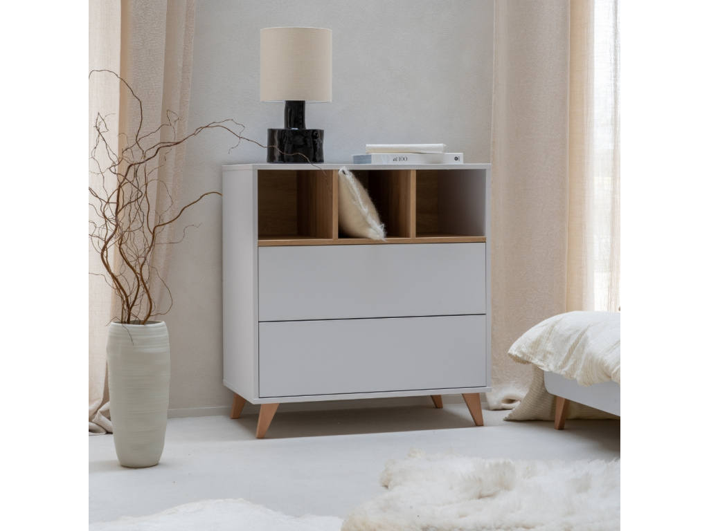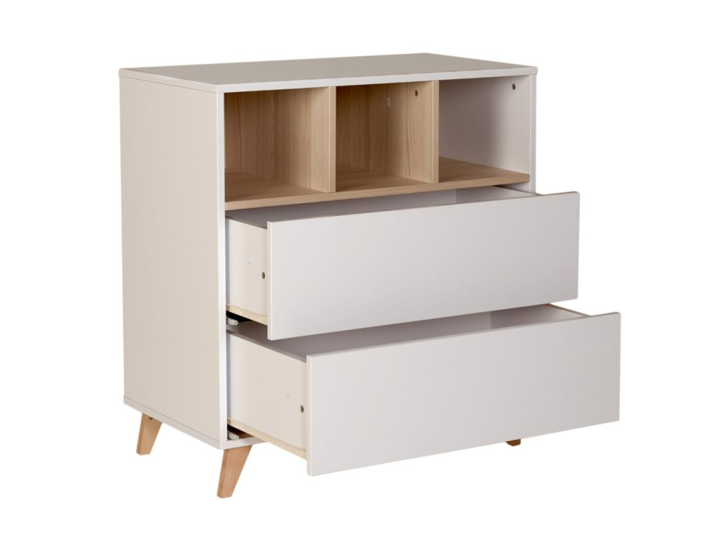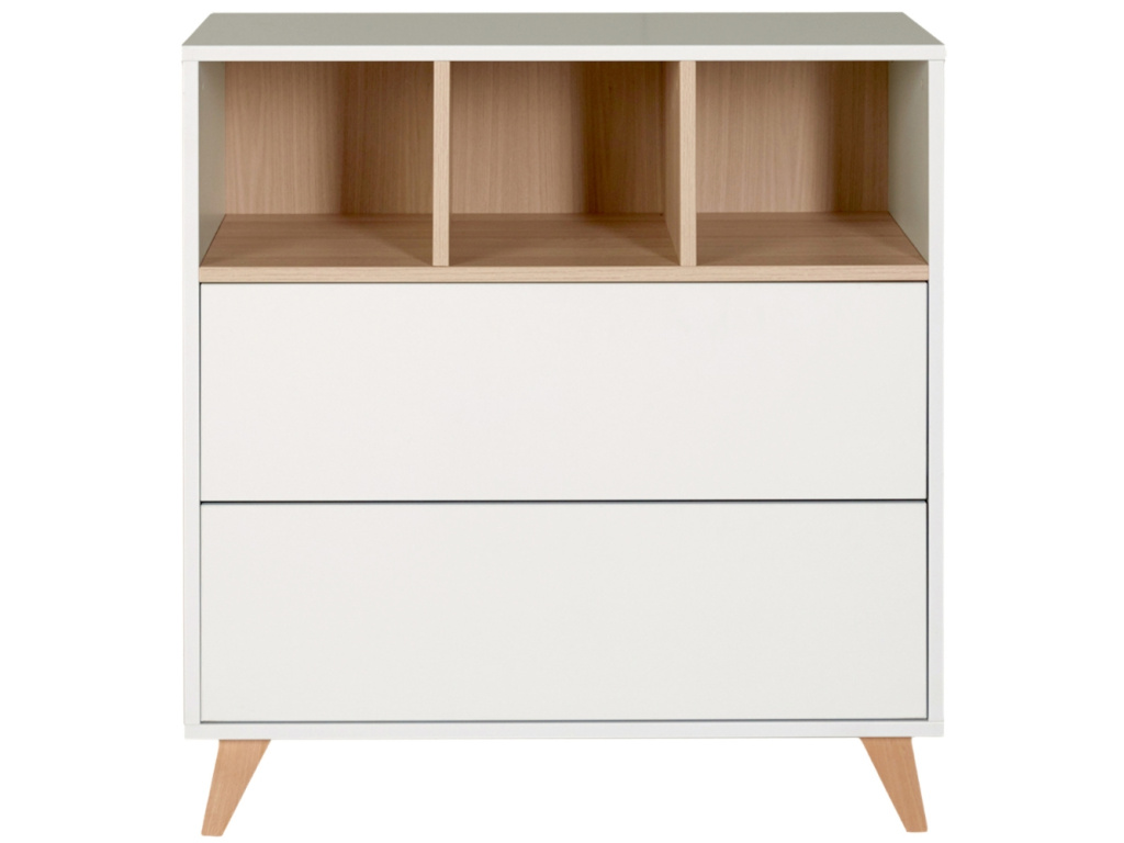 Nedílnou součástí každého pokoje pro miminko je přebalovací pult. Značka Quax přichází s řadou Loft, která vás zaujme nejen svým minimalistickým designem, ale také praktičností a funkčností. Korpus je kompletně vyrobený z laminátu v něžné bílé barvě, která v kombinaci s masivní bukovou podnoží a stejně zbarvenými přihrádkami vytváří jemný a vzdušný kontrast. Komoda disponuje 3 otevřenými přihrádkami pro snadnější přístup k věcem, které potřebujete mít při přebalování po ruce. Dále disponuje 2 prostornými zásuvkami, které bohatě postačí pro uložení oblečení pro vaše miminko. Komodu lze využít samostatně nebo při dokoupení nástavby se z ní rázem stane přebalovací pult. Doporučujeme kombinaci více prvků z řady Loft, abyste vytvořili dokonalý kontrast a souhru v interiéru. Komoda Loft se skvěle hodí do minimalistických či skandinávských interiérů.