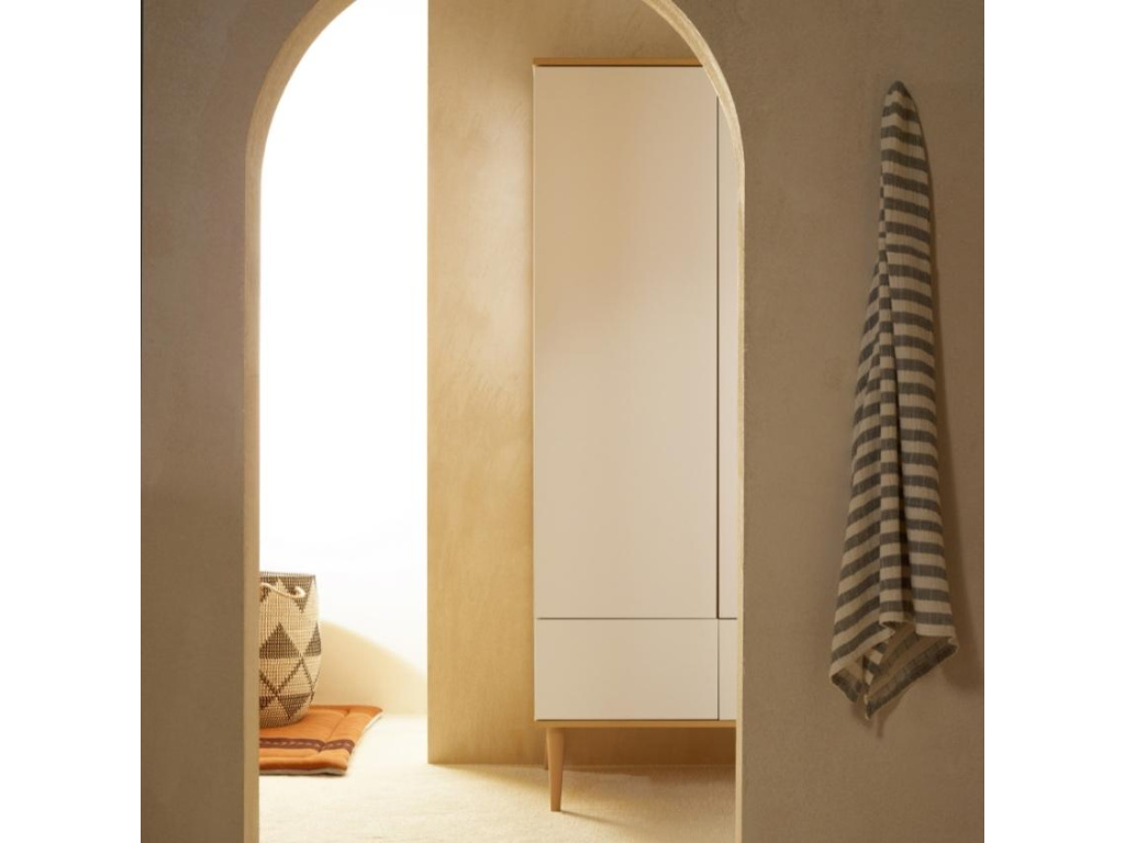Moderní designová skříň Quax Flow je béžově lakovaná a získá si pozornost díky praktickému úložnému prostoru. Univerzální nadčasový vzhled se hodí do skandinávských i minimalistických interiérů. Několik nastavitelných polic, 2 zásuvky a tyč pro zavěšení ramínek je ideální kombinace kam se vejde všechno dětské prádlo.
