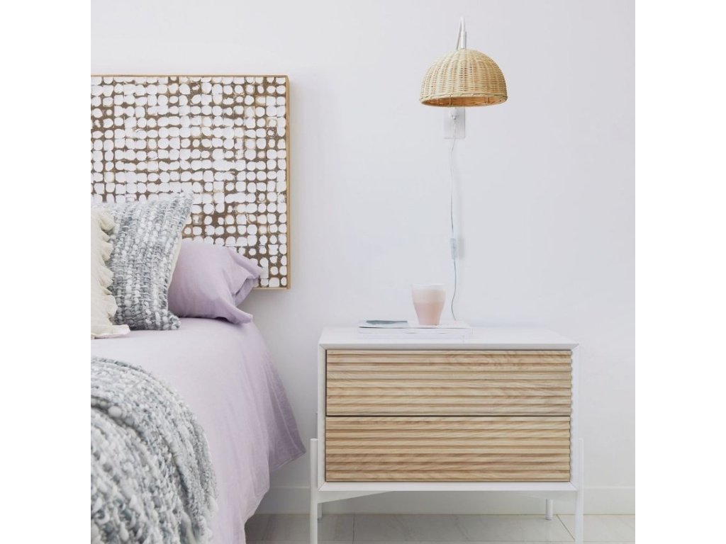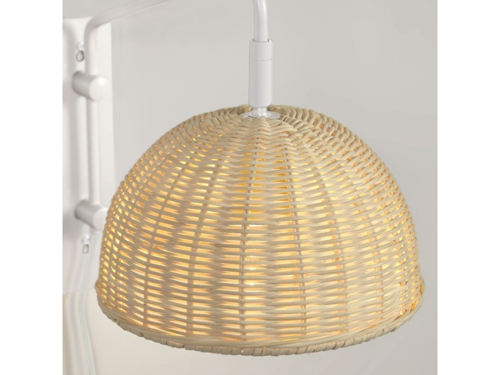 Stylové nástěnné světlo Kave Home Damila s ratanovým stínidlem se hodí především do přírodně laděných interiérů světlejších barev. Bíle lakované kovové zavěšení k přírodně zbarvenému stínidlu skvěle pasuje. Výsledkem je elegantní a čistý vzhled světla. Světlo můžete umístit například nad noční stolek v ložnici - ušetříte díky němu prostor na desce stolku.