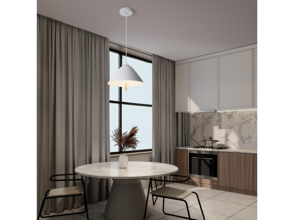 LED světlo Oros od Nova Luce je elegantní závěsné svítidlo s minimalistickým designem, které se hodí do moderních interiérů. Bílé kovové kuželovité stínidlo směruje světlo směrem dolů, což vytváří příjemnou a útulnou atmosféru. Stínidlo je zakončeno zlatým detailem, jenž mu přidává jemný kontrast a nádech luxusu. Teplota světla 3000 K poskytuje teplé bílé osvětlení, které je vhodné do obytných prostor, jako je jídelna nebo obývací pokoj. Díky své jednoduchosti a sofistikovanosti se Oros snadno začlení do různých stylů interiéru.