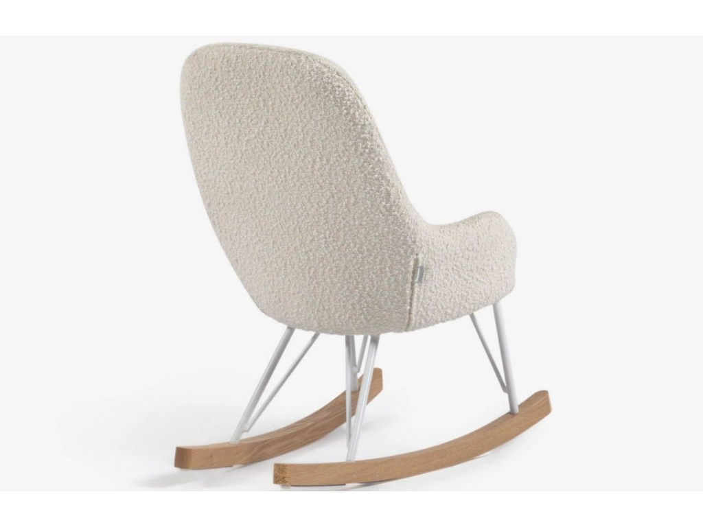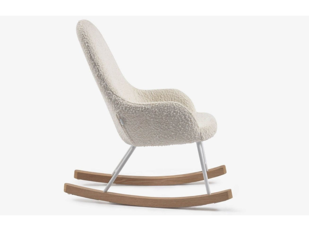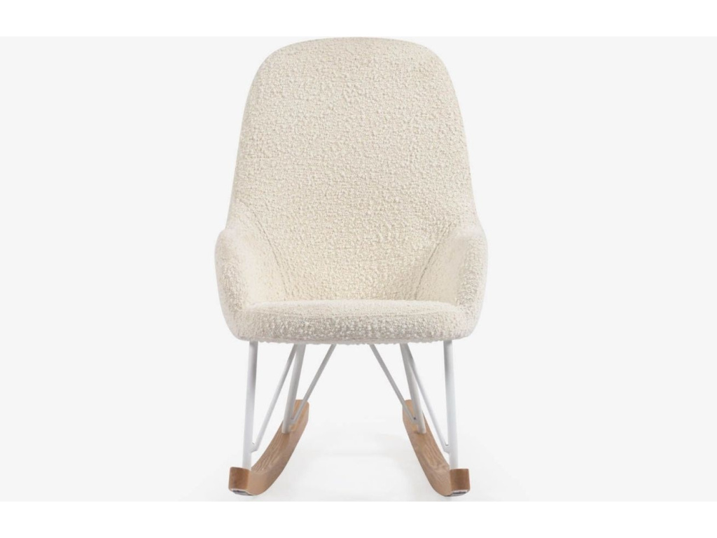Bílé látkové dětské houpací křeslo Kave Home Joey v jednoduchých elegantních liniích se perfektně hodí do každého minimalistického a vzdušného interiéru. Kovová podnož s dřevěnými ližinami tvoří skvělé designové spojení. Křeslo je potaženo pevnou strukturovanou látkou bílé barvy. Na ližinách se nachází protiskluzové plstěné podložky pro ochranu vaší podlahy.