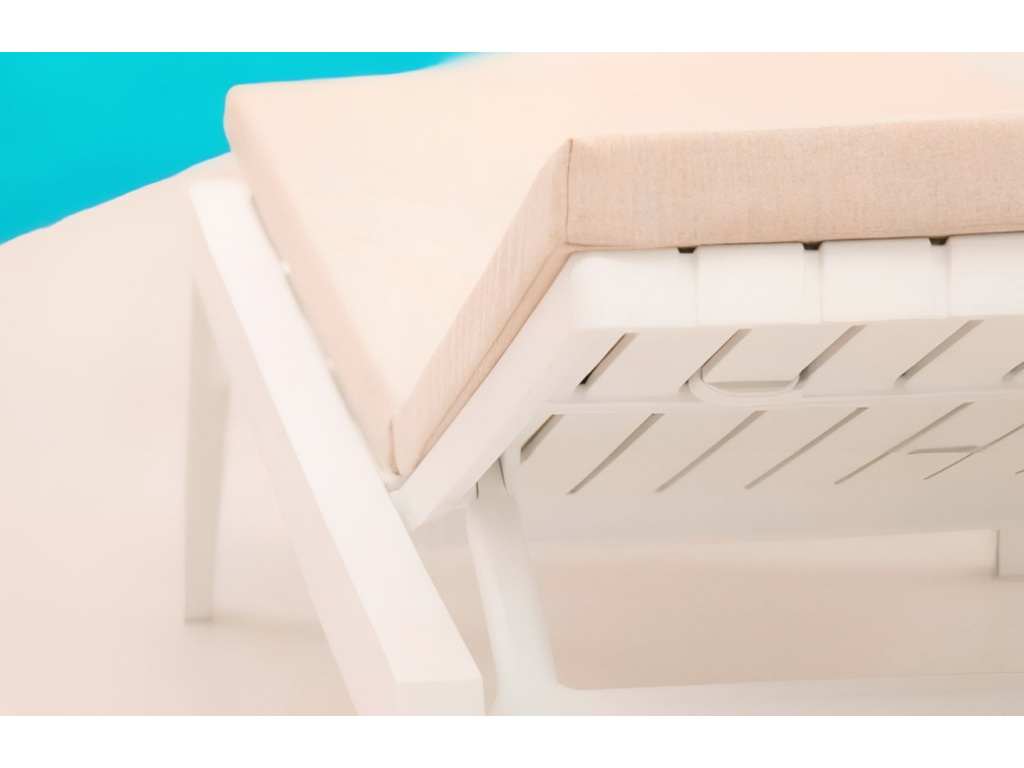 Pozn.: Při delším nepoužívání doporučujeme nábytek v exteriéru přikrývat, nebo je uschovat do krytých prostor. Udržujte je v dostatečné vzdálenosti od zdrojů nadměrného tepla. K čistění nikdy nepoužívejte agresivní čistící prostředky. Interiérové fotografie jsou pouze ilustrační, barva lehátka je bílá.