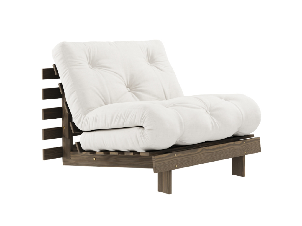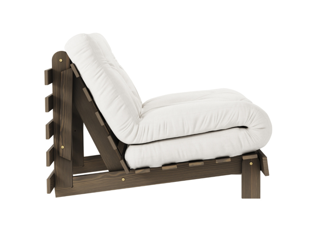Rozkládací křeslo Roots od značky Karup Design se rychle stane vaším oblíbeným společníkem při chvilkách odpočinku. Elegantní a stylové křeslo proměníte jednoduchým pohybem na praktické a pohodlné lůžko. Konstrukce z hnědého masivního borovicového dřeva s FSC certifikací je doplněna kvalitní 12 cm vysokou futonovou matrací, která v sobě kombinuje recyklovaná vlákna a 4 cm pěnu. Křeslo Roots skvěle doplní skandinávsky a minimalisticky laděné domovy. Ideální je například pro menší interiéry, kde oceníte další místo na spaní. Vybrat si ho můžete v široké škále barev.