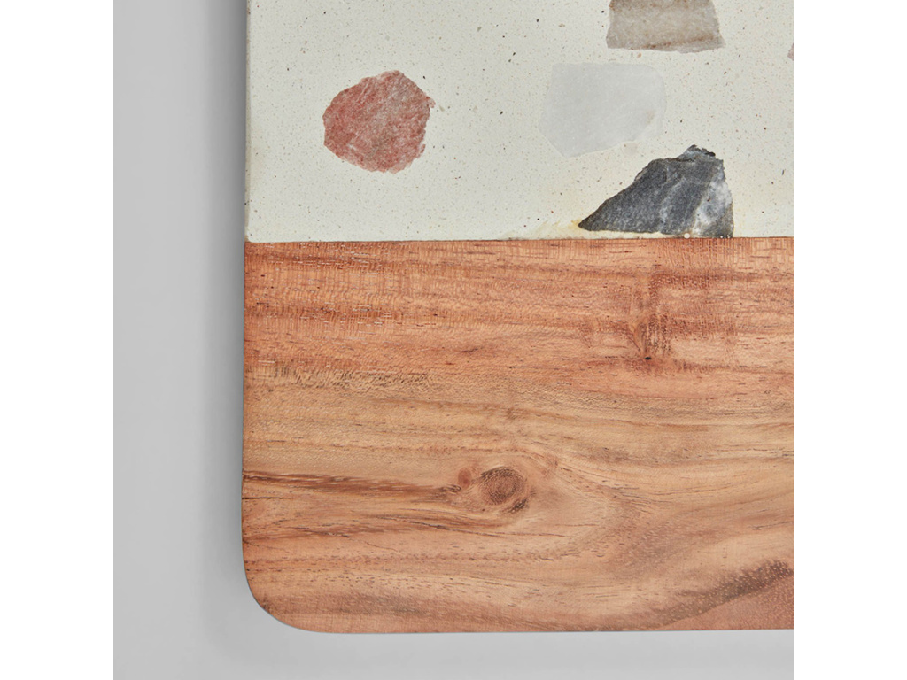 Servírovací prkénko Kave Home Temira si zamilují zejména milovníci svěžího a neotřelého designu. Kombinuje materiál akáciové dřevo a terrazza, které díky svému zpracování posune na vyšší úroveň. Toto prkénko je ideální například na podávání sýru při posezení s přáteli u vína.