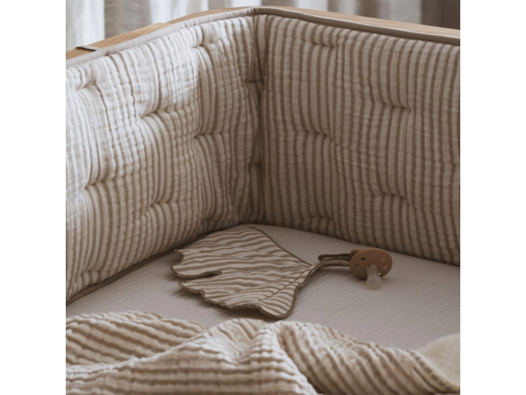Mantinel do postýlky Quax Natural přinese do dětského pokojíčku něžnost, útulnost a pocit bezpečí při spánku i hraní. Díky praktickým tkaničkám ho snadno připevníte k postýlce nebo ohrádce, kde bude pevně držet na svém místě. Je oboustranný, ušitý z jemného mušelínu a dostupný ve třech něžných odstínech. Látka navíc nese hrdě označení OEKOTEX, které zaručuje, že materiál byl přísně testován na škodlivé látky a splňuje nejpřísnější bezpečností standardy. Doporučujeme kombinovat s dalšími doplňky ze stejnojmenné kolekce.