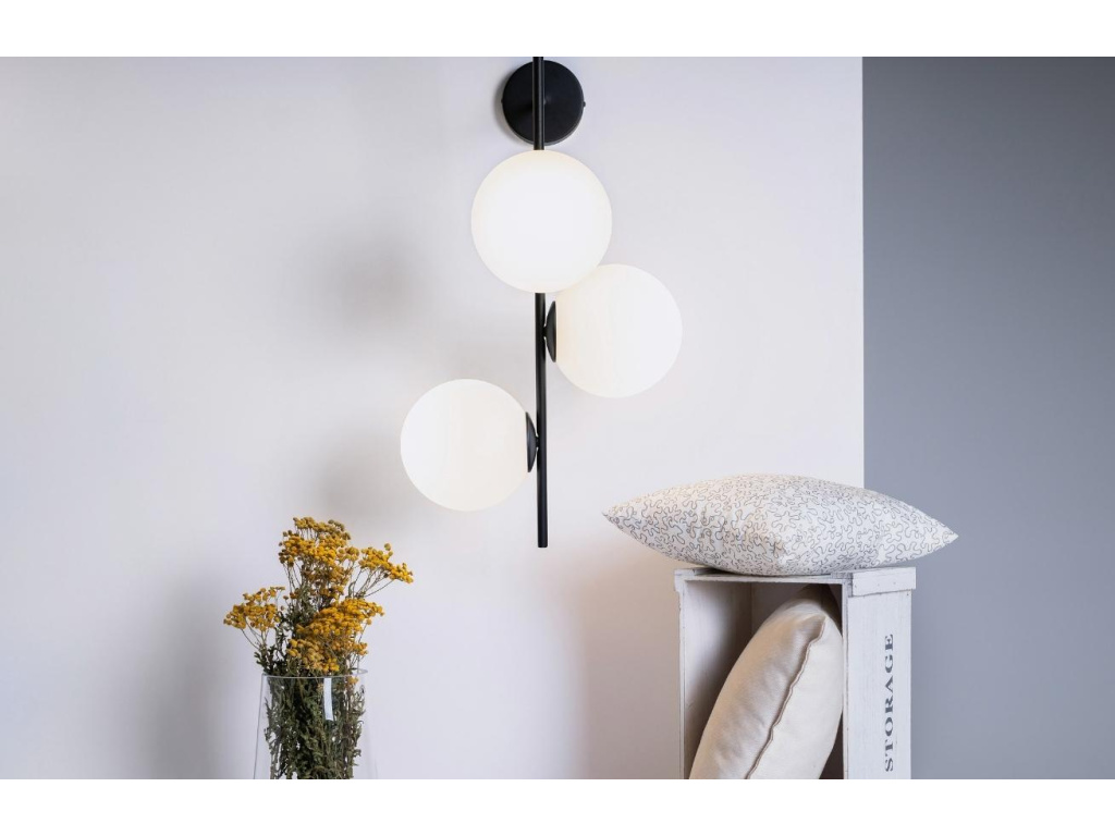 Designové nástěnné světlo Bubbly zaujme na první pohled svým vzhledem. 3 stínidla z mléčného skla ve tvaru koule vytváří společně s lakovaným kovovým držákem jedinečný kontrast, který do vaše interiéru vnese nádech elegance. Lampa Bubbly rozzáří každý kout vašeho interiéru. Je libo nástěnné světlo, stojací či stolní lampu? Stačí si vybrat. Světla z řady Bubbly jsou dostupná v několika provedeních.