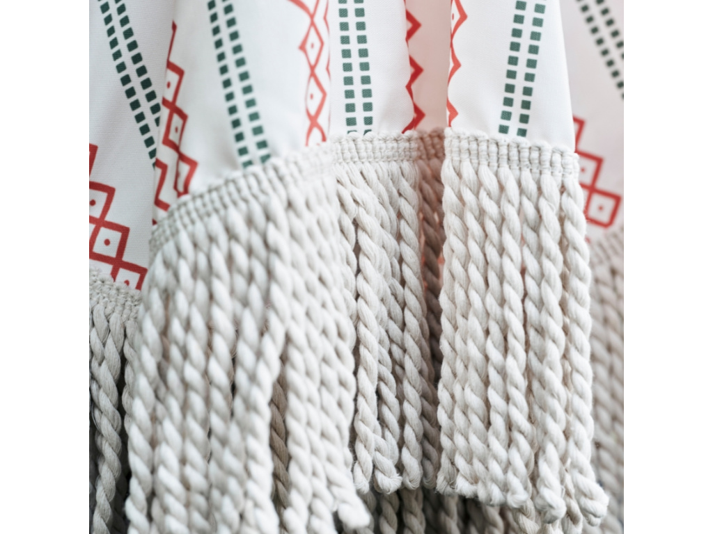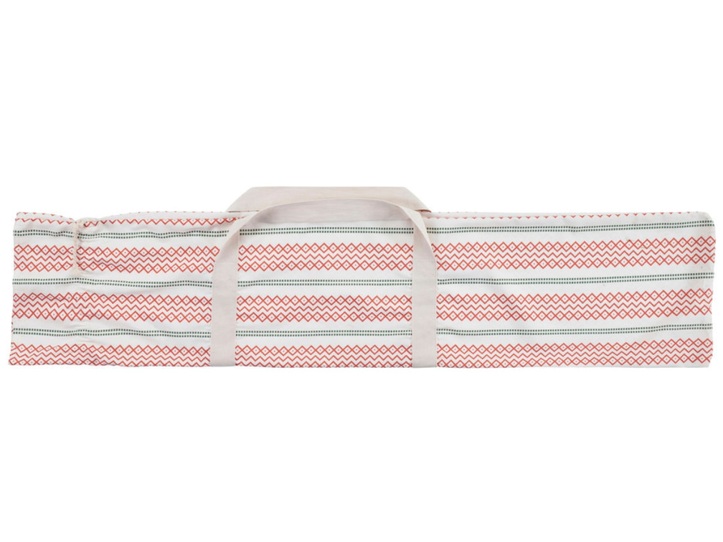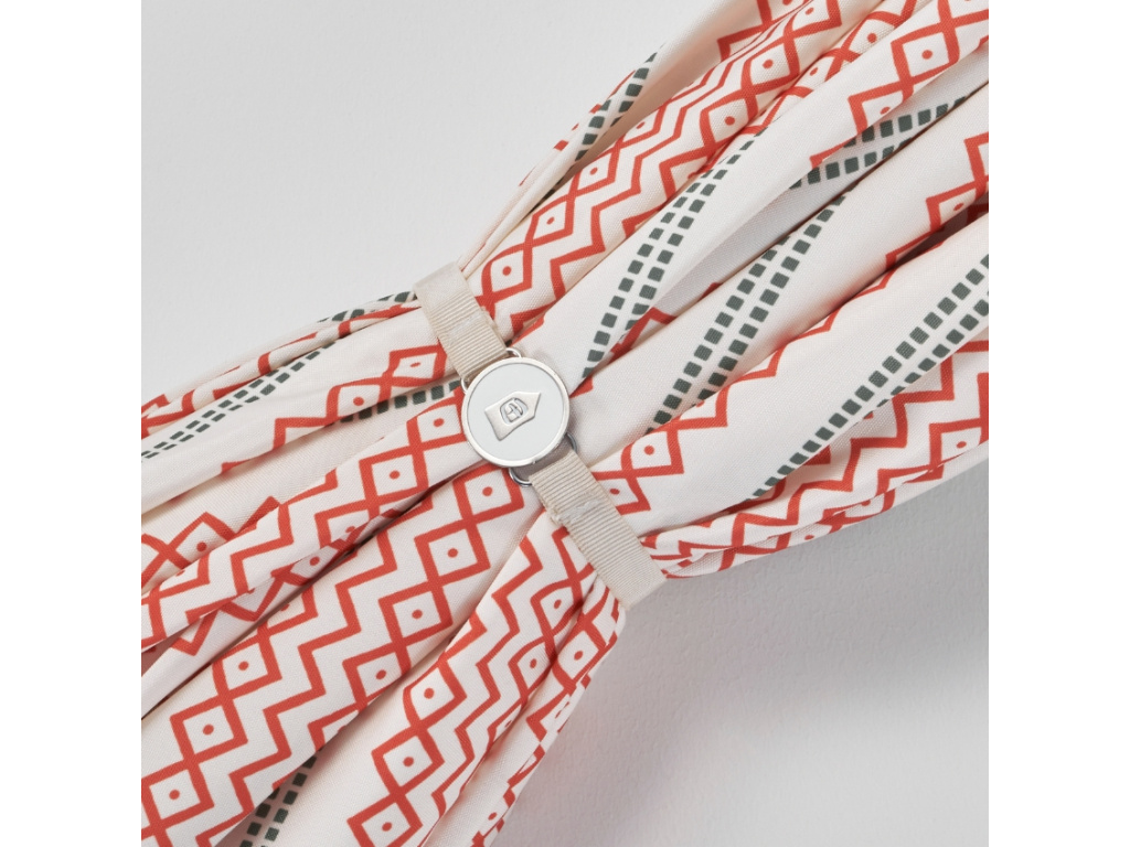V teplém dni na balkoně nebo zahradě se o příjemný stín postará slunečník Umbra od značky House Doctor. Nabízí nezaměnitelný nádech vintage designu díky geometrickému červeno-zelenému vzoru na bílém podkladu společně s dlouhými hustými třásněmi. Potah je vyroben z polyesteru, tudíž má voděodolnou vlastnost a snese i nečekaný déšť. Dřevěná tyč lze rozebrat, takže můžete slunečník snadno složit do ochranného obalu – díky němu si ho můžete vzít i s sebou k vodě.