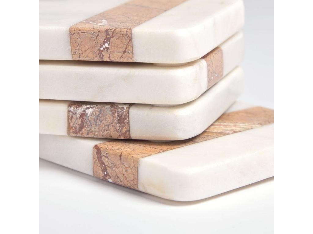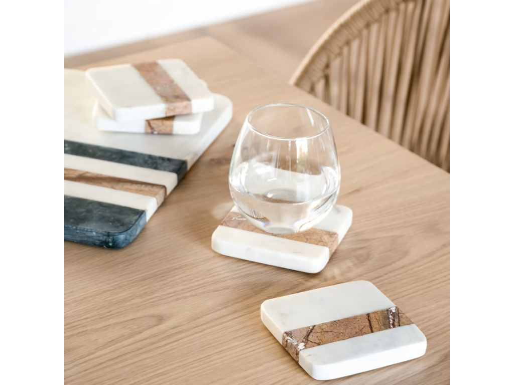 Set podtácků Saskia značky Kave Home v sobě skrývá čtyři čtvercové podtácky o velikosti 10x10 cm, které jsou vyrobeny z přírodního mramoru. Přineste na svůj stůl styl a eleganci s tímto originálním designovým kouskem. Doplnit je můžete mramorovým servírovacím prkénkem ze stejnojmenné série.