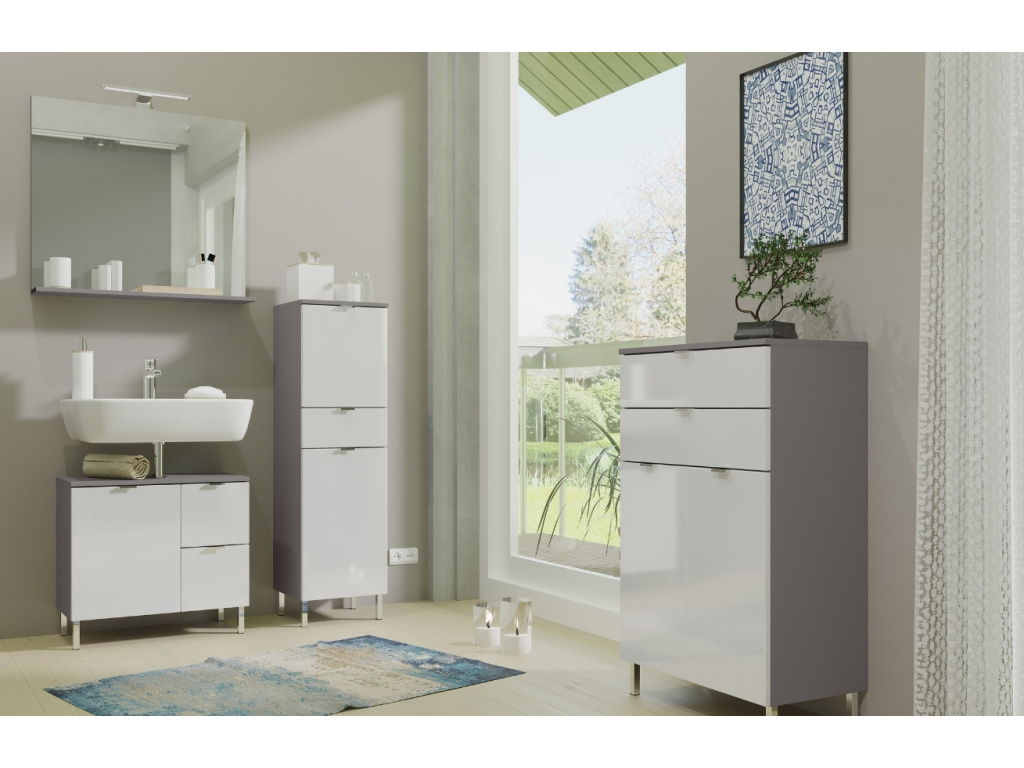 Minimalistická koupelnová skříňka Mauresa zaujme na první pohled svým designem. Čelo je vyrobeno z vysoce leskle bíle lakované MDF a v kombinaci s korpusem z dřevotřísky v grafitové barvě, který je potažen melaminovou pryskyřicí dodává skříňce jemný nádech a osobitý design, který se jen tak neokouká. Úložiště pro vaše ručníky či kosmetiku je rozděleno na 4 prostorné uzavřené police a 1 zásuvku. Elegantním prvkem, který dotváří celkový vzhled skříňky, jsou bezesporu kovové úchytky, které doladí celkový vzhled k dokonalosti. Příjemným prvkem je systém soft close, díky kterému se dvířka a zásuvka sami dovřou a neotlučou se. Skříňku lze využít jako úložný prostor nejen do koupelny, ale také do kuchyně, chodby či ložnice. Díky nárazuvzdorným ABS hranám máte vyšší jistotu odolnosti. Doporučujeme kombinace všech produktů z řady Mauresa.